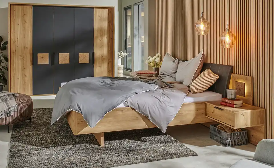 - Mehr zu AusführungPolsterkopfteil in Kunstleder in Anthrazit2 Nachtkonsolen schwebend mit je einem AuszugDrehtürenschrank 5-trg.in Bianco-Eiche-Nachbildung mit Hirnholz-Optik Applikationen