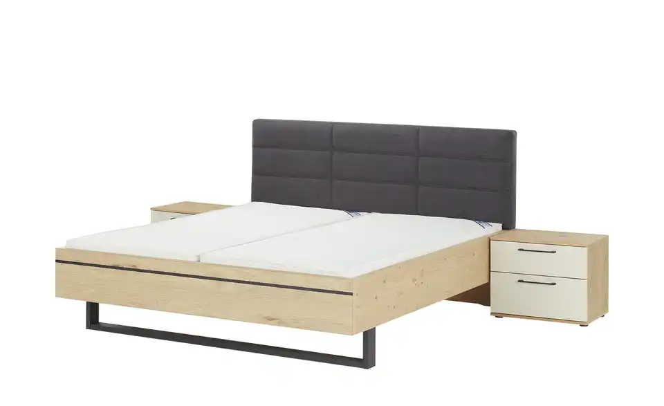 - Mehr zu Ausführung6-trg. Drehtürenschrank mit Bauchbinde in Riffholz mit Leisten in Anthrazit (BHT 299,2 x 229,4 x 59,5 cm)Luxus Doppelbett mit Polsterkopfteil in Stoff Anthrazit, Fußteil mit Kufe2x Nachtkonsolen mit je 2 Schubkästen, Breite ca. 60 cm