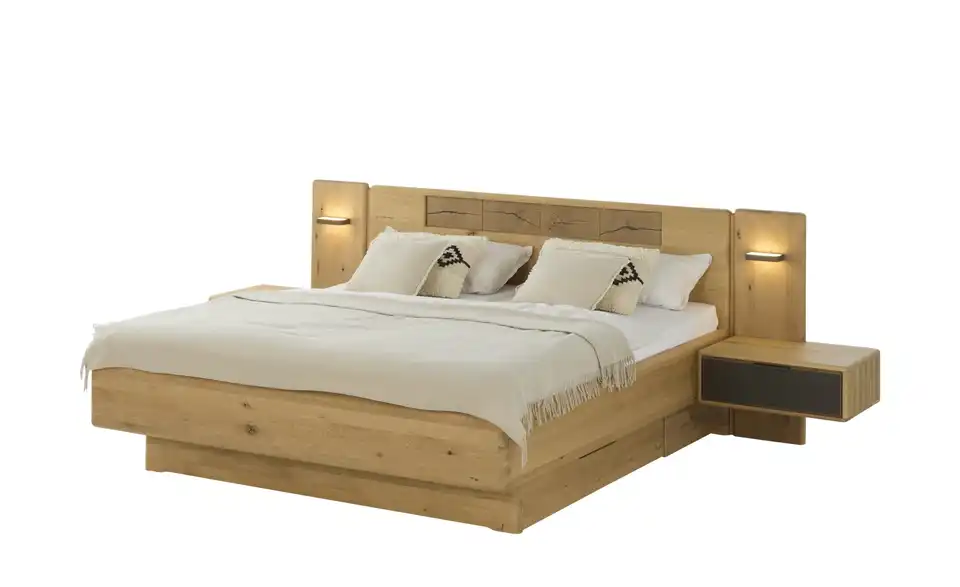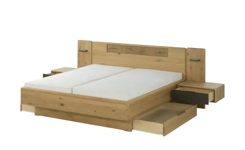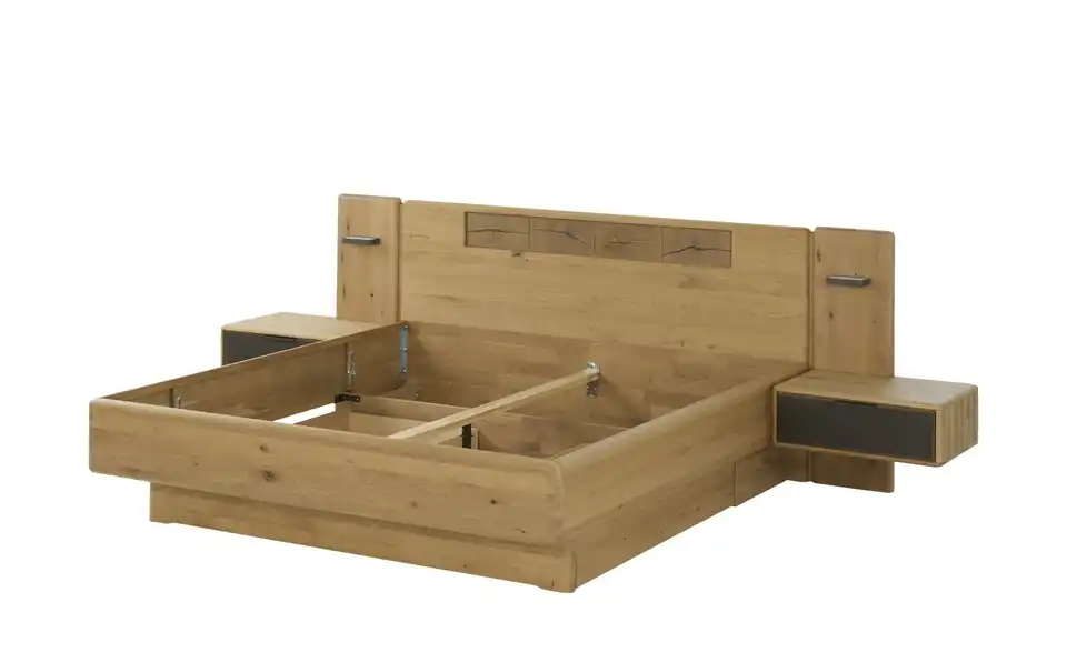 - Lieferumfang / mitgeliefertes ZubehörDoppelbettgestellNachtkonsolen links und rechtsNachtkonsolen-Paneele links und rechts inklusive LED-BeleuchtungBettschubkästen