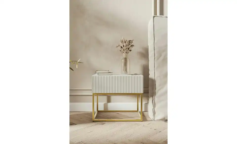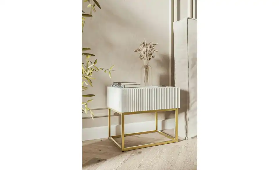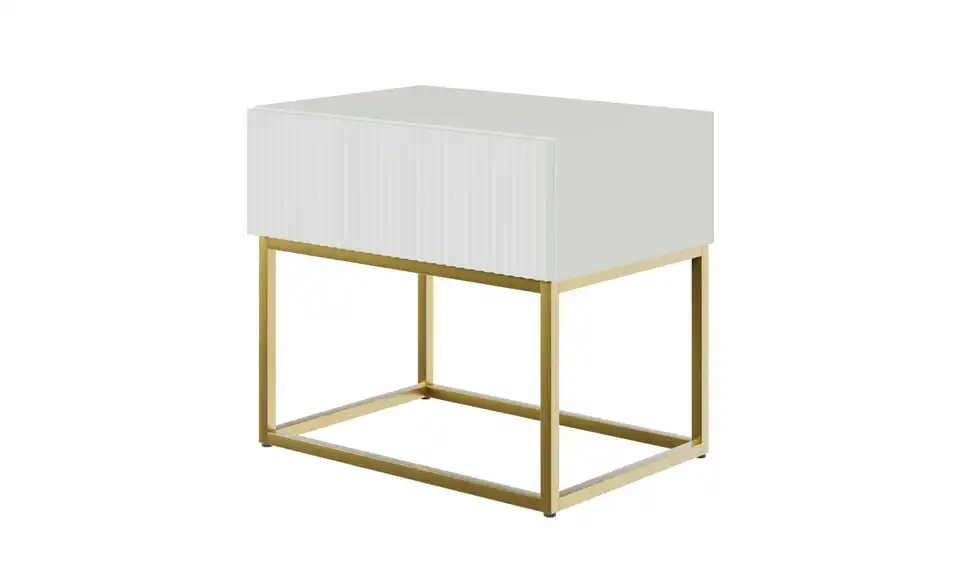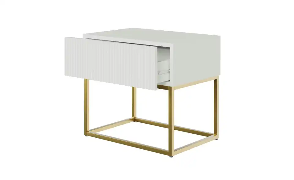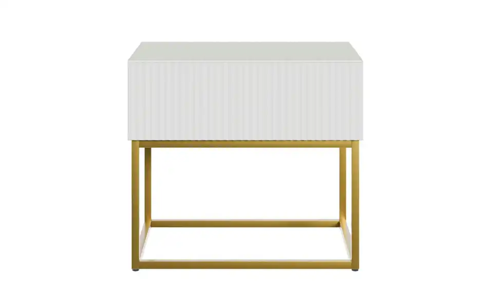 - Lieferumfang / mitgeliefertes ZubehörWeißer Nachttisch mit goldenem Kufengestell