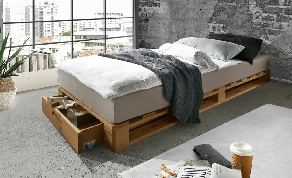 - Lieferumfang / mitgeliefertes ZubehörPalettenbett 90x200 cm Kiefer gelaugt mit 1 Rollschubkasten