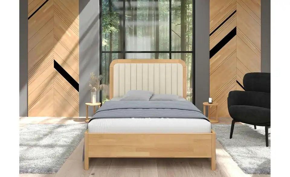 - Lieferumfang / mitgeliefertes ZubehörMassivholzbettgestell mit gepolstertem Kopfteil