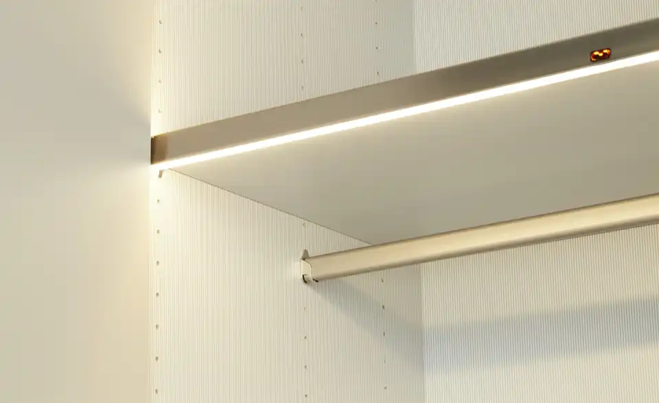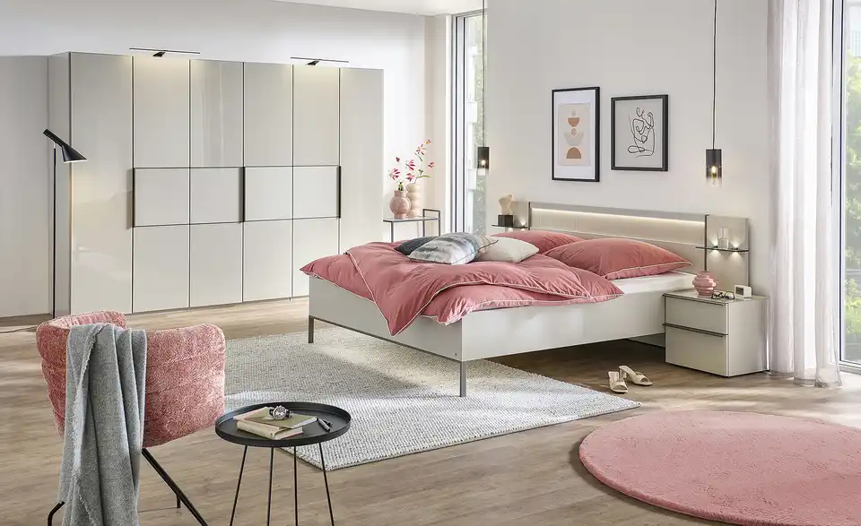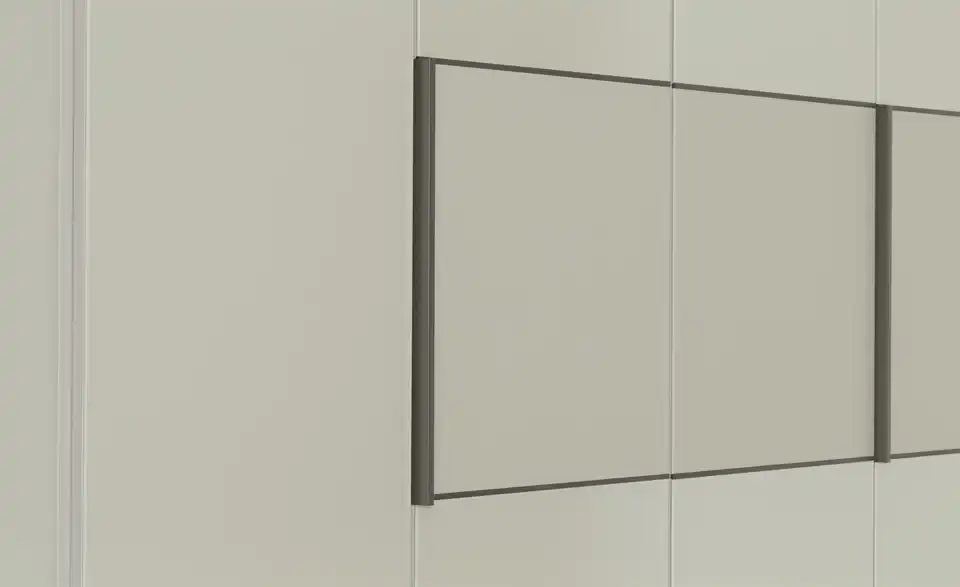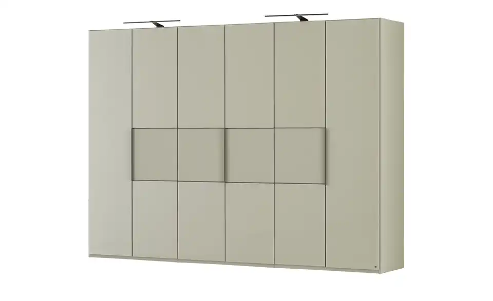 - Mehr zu Ausführung6 türiger Kleiderschrank mit kieselgrauen Glasfronten und matten kieselgrauen Elementen in den MitteltürenGlasauflagen für Schrankaußenseiten links und rechts2er Set LED-Line-Aufbauleuchten in schwarz