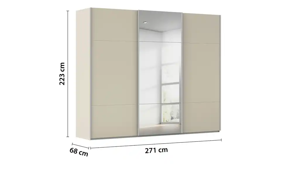 - Mehr zu AusführungDreitüriger Schwebetürenschrank mit Spiegel inkl. ZubehörBestehend aus drei Elementen (je ca. 90 cm breit)