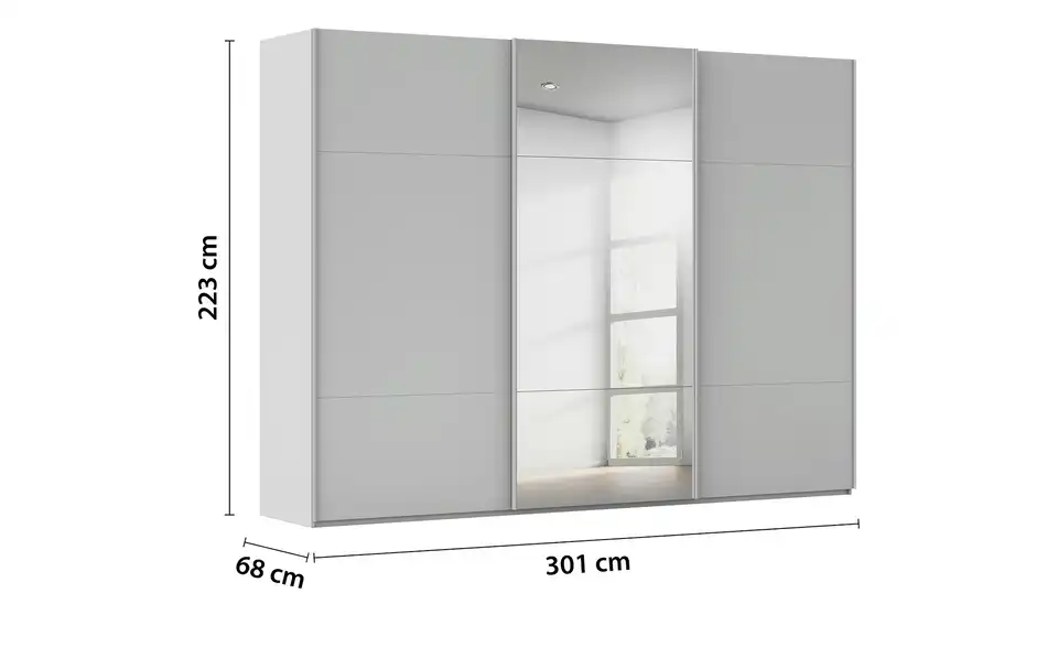 - Mehr zu AusführungDreitüriger Schwebetürenschrank mit Spiegel inkl. ZubehörBestehend aus drei Elementen (je ca. 100 cm breit)