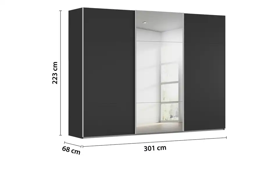 - Mehr zu AusführungDreitüriger Schwebetürenschrank mit Spiegel inkl. ZubehörBestehend aus drei Elementen (je ca. 100 cm breit)