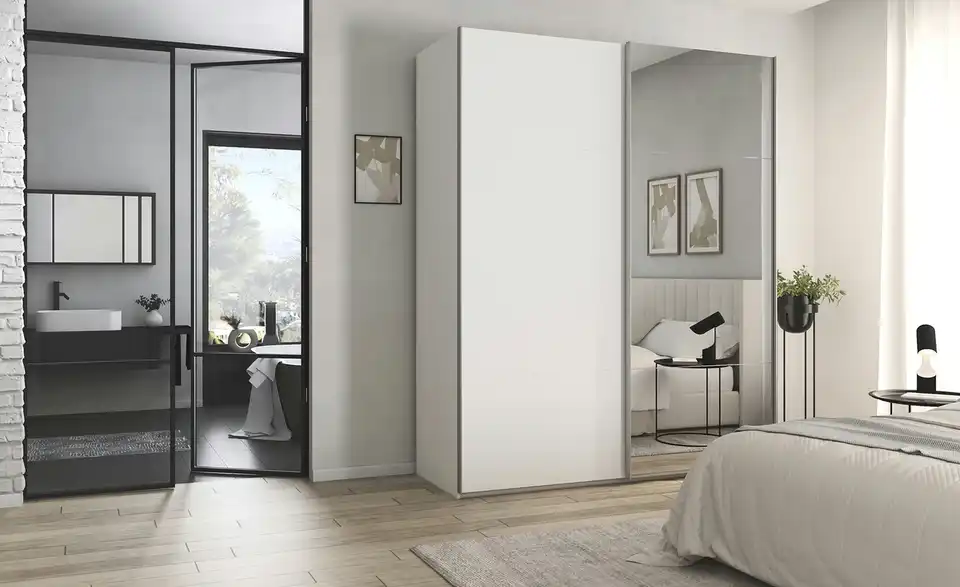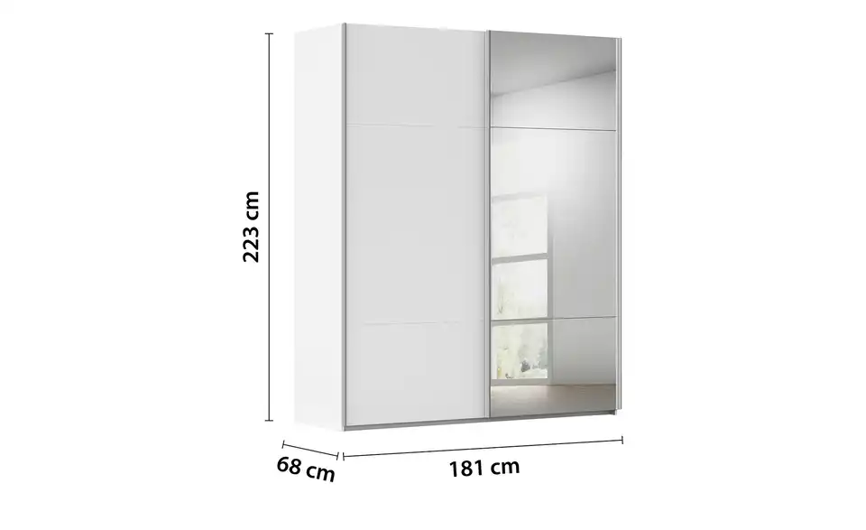 - Mehr zu AusführungZweitüriger Schwebetürenschrank mit Spiegel inkl. ZubehörBestehend aus zwei Elementen (je ca. 90 cm breit)