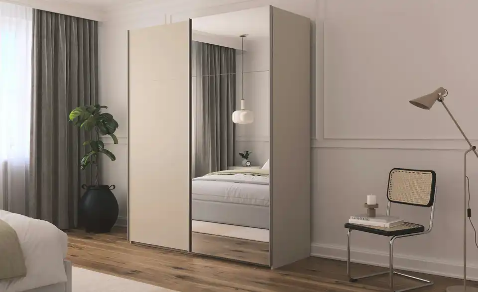 - Mehr zu AusführungZweitüriger Schwebetürenschrank mit Spiegel inkl. ZubehörBestehend aus zwei Elementen (je ca. 90 cm breit)