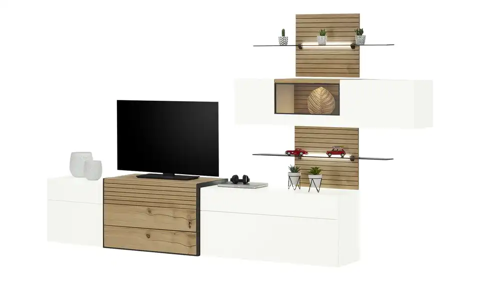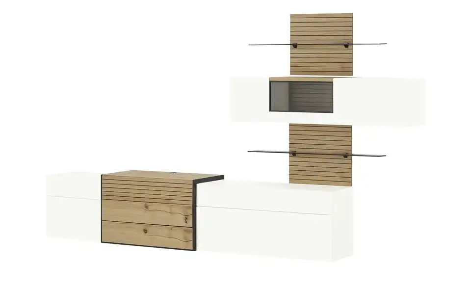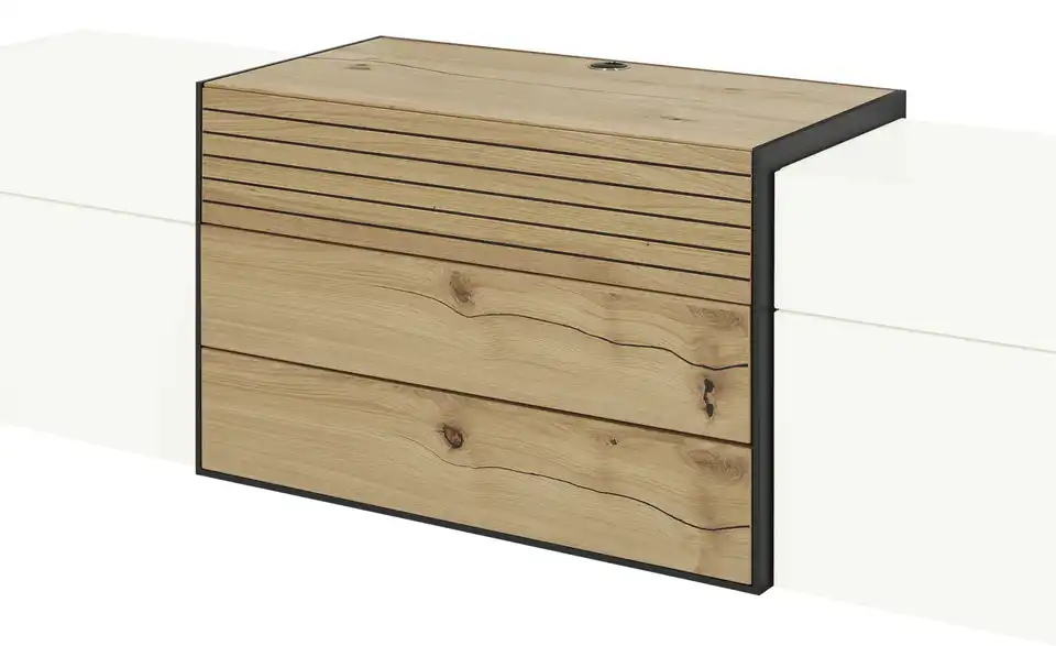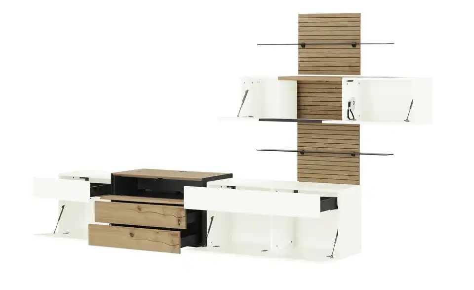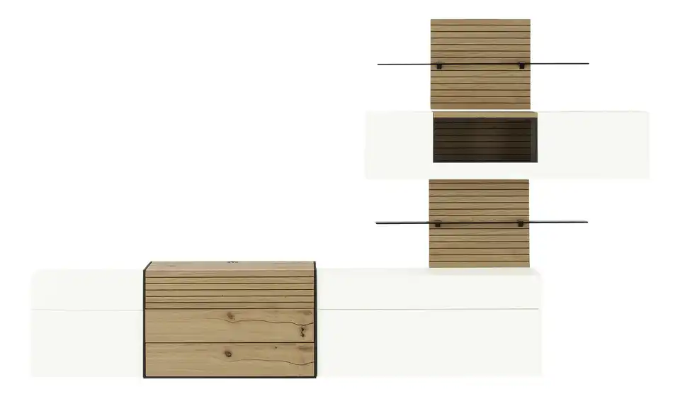- Mehr zu MaterialKorpus und Front aus Holzwerkstoff lackiert in Polarweiß mattAbsetzungen aus Eiche hell furniertFrontverglasung in Parsol Grau