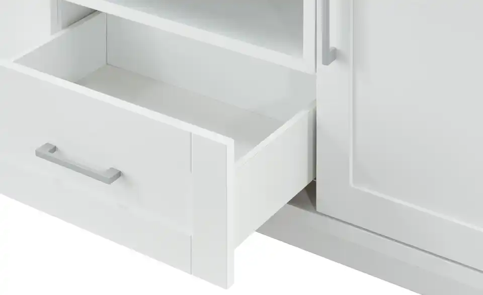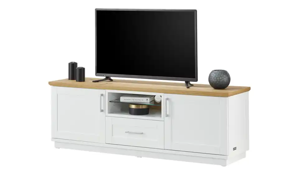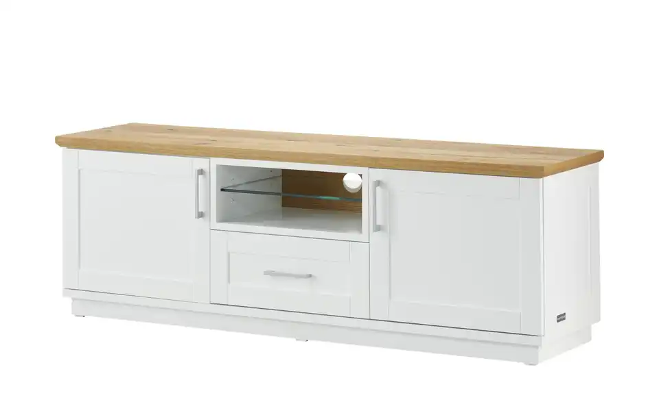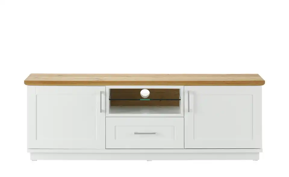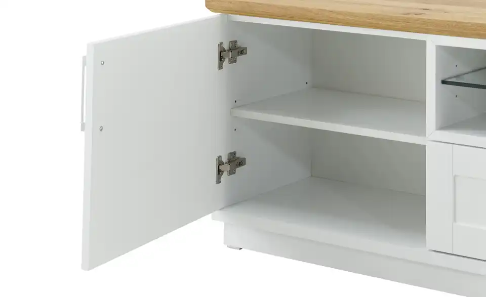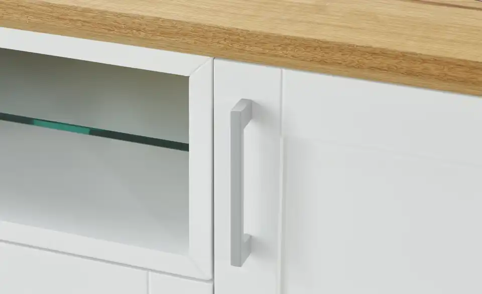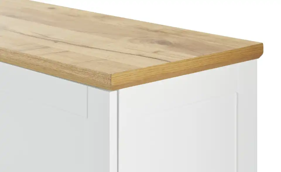 - Mehr zu MaterialKorpus und Front aus Holzwerkstoff melaminbeschichtet in Weiß matt lackiertDeckplatte aus Holzwerkstoff furniert in Wildeiche gewachst