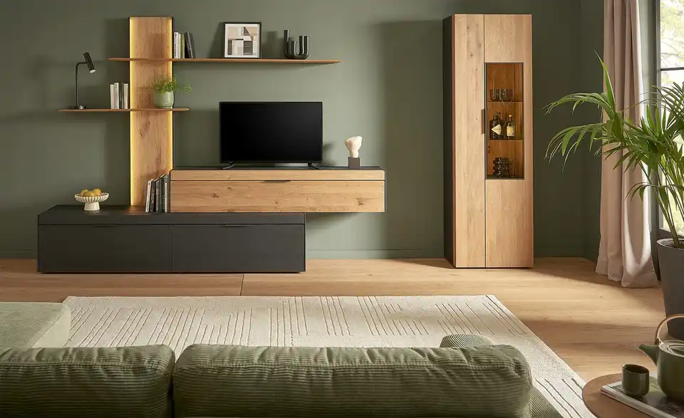 - Mehr zu MaterialKorpus aus Eiche massiv lackiert in AnthrazitFront aus Kerneiche Umato massiv gebürstetsichtbare Rückwand in sangestrahlter Riffeiche
