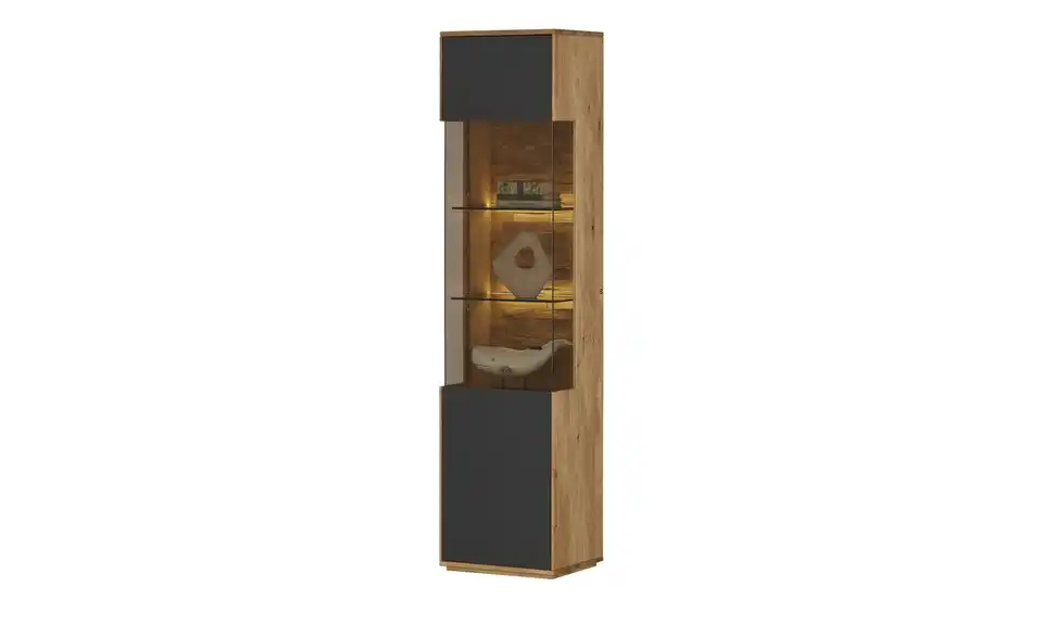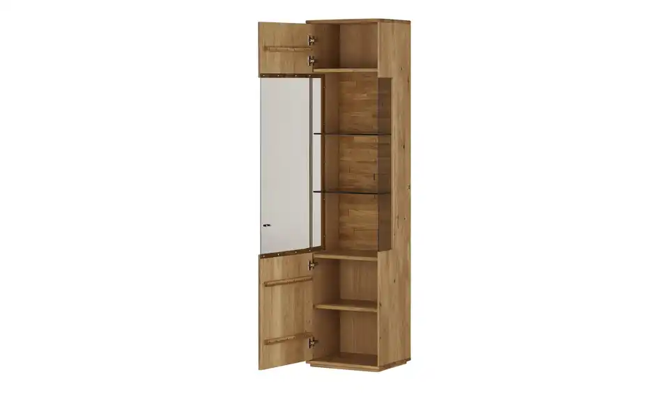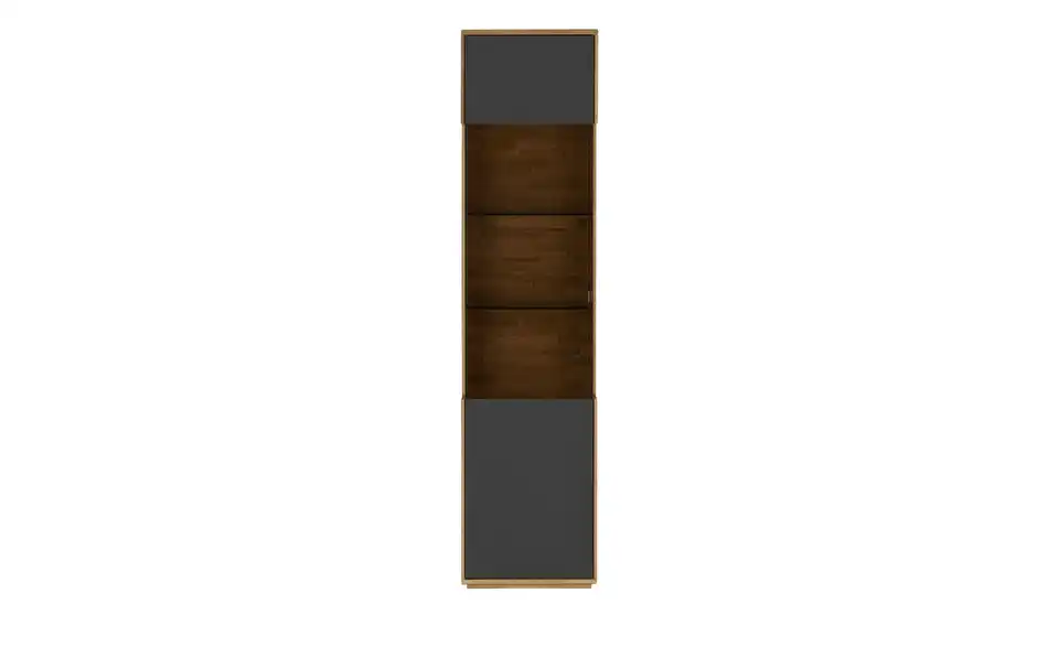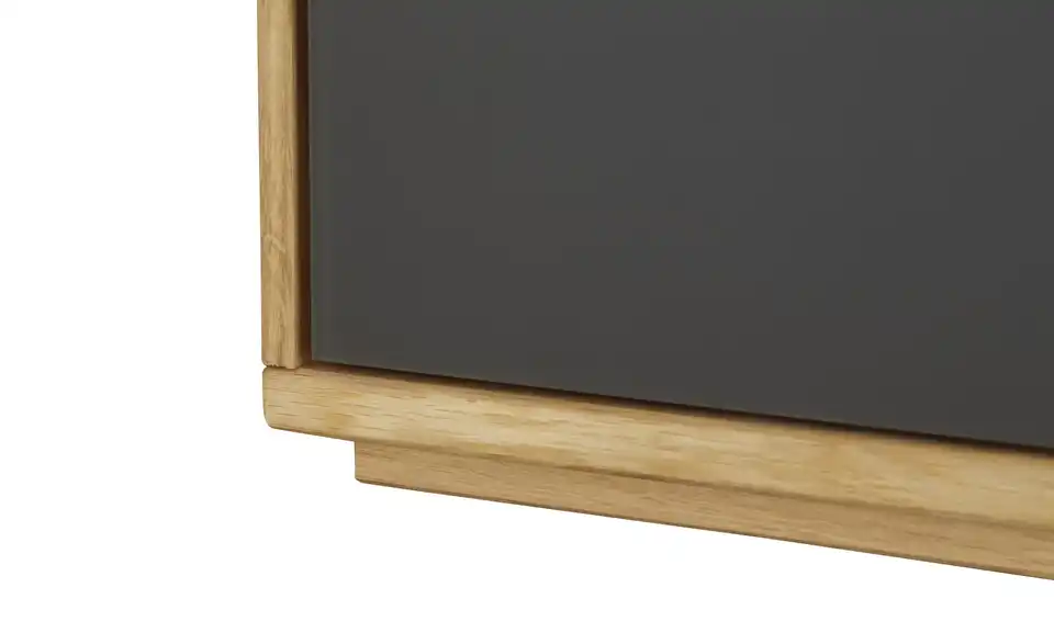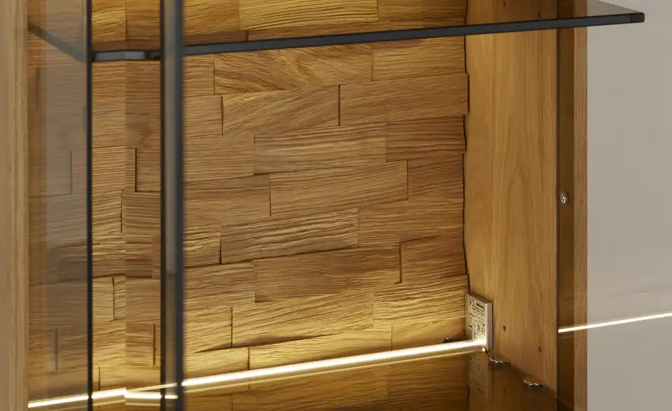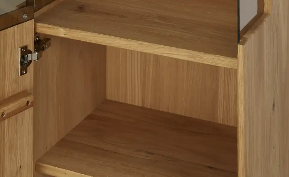 - Mehr zu MaterialKorpus aus Massivholz furniert in Wildeiche geöltFront aus Glas in Anthrazitsichtbare Rückwand aus Holzwerkstoff furniert in Spalt-Eiche