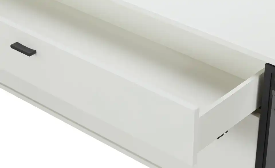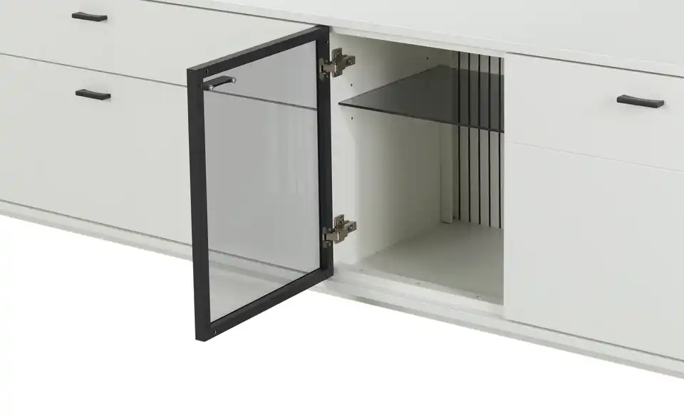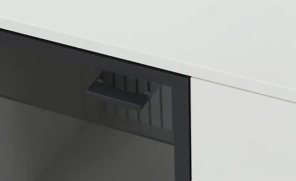 - Mehr zu MaterialKorpus und Front aus Holzwerkstoff lackiert in Weißsichtbare Rückwand in Lamellenoptik Weiß lackiertFrontverglasung in Parsol Grau