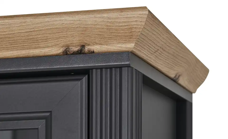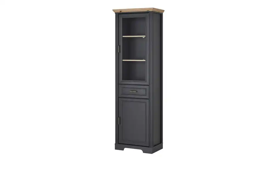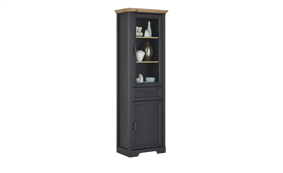 Mit der Serie Varese richten Sie Wohn- oder Speiszimmer ein. Teil der Serie ist diese Vitrine. Sie ist passend zu den anderen Modellen im Landhausstil designt. Front und Korpus sind graphitgrau, Abdeckplatte und sichtbare Böden setzen sich in Asteiche (Nachbildung) ab. Der obere Teil der Vitrine verfügt über eine Tür aus Klarglas, durch die Sie in die drei Fächer dahinter blicken können. Eine LED-Beleuchtung für diese Fächer ist im Lieferumfang enthalten. Weiteren Stauraum finden Sie in einer Schublade und hinter der unteren Tür.Lieferung & Versand