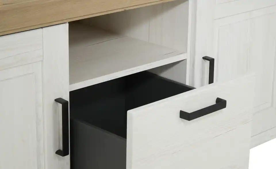 - Mehr zu MaterialKorpus aus Holzwerkstoff beschichtet in Pinie Aurelio (Nachbildung)Front aus Holzwerkstoff tiefgezogen in Pinie Aurelio (Nachbildung)Absetzung aus Holzwerkstoff beschichtet in Eiche Artisan (Nachbildung)Griffe aus Metall in Schwarz eloxiert