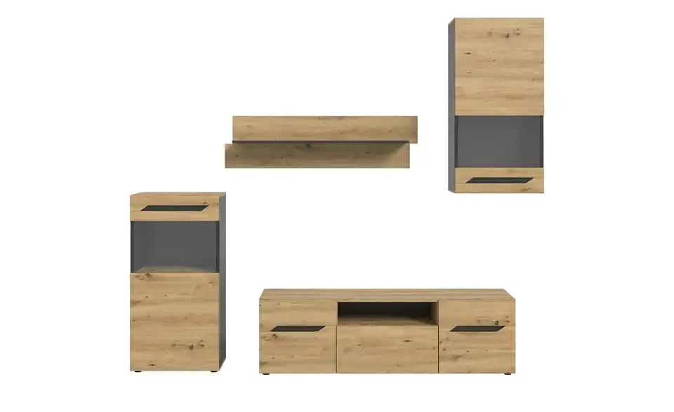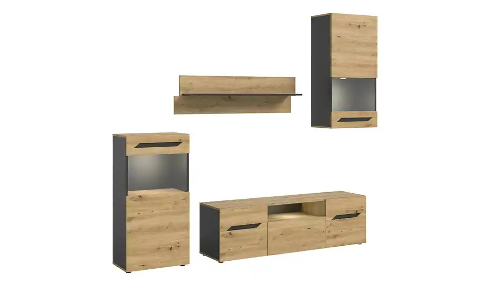 - Bestehend ausVitrineLowboardWandboardHängeschrank