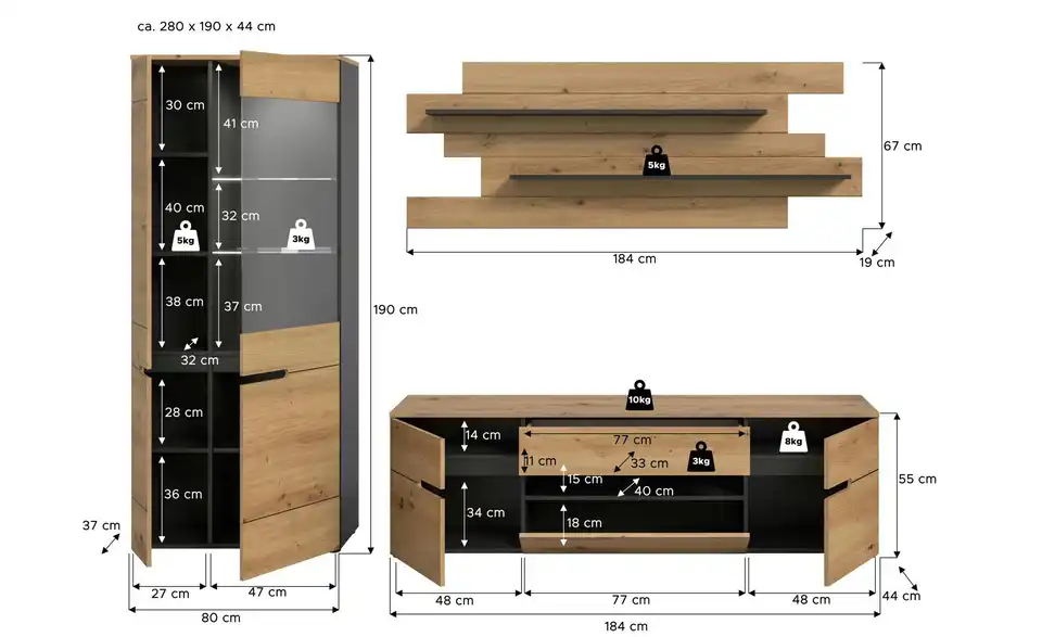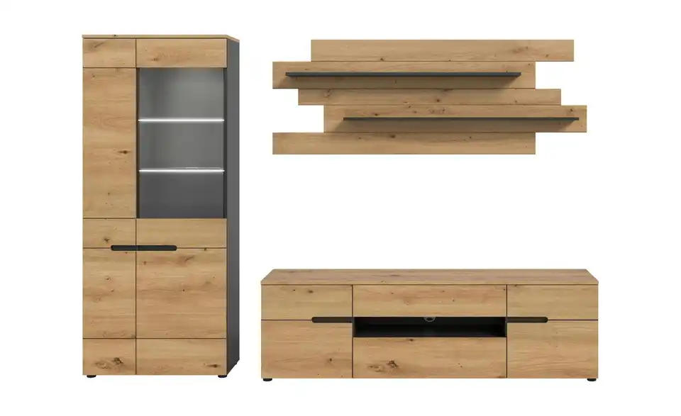 - Lieferumfang / mitgeliefertes Zubehör1x Vitrine, 1x Lowboard, 1x Wandboard, Beleuchtung