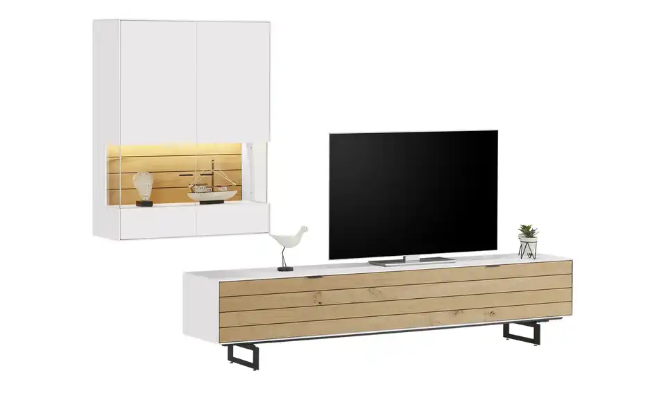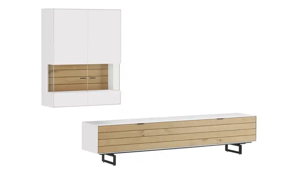Die Designer-Serie Como der Marke Jette Home präsentiert sich modern und minimalistisch. Eine gerade Linienführung und zeitlose Farben machen die Serie kombinationsfreudig und vielseitig einsetzbar. Diese Wohnkombination besteht aus einer Vitrine und einem Lowboard. Insgesamt sieben Fächer, davon ein Vitrinenfach, stehen Ihnen zur Verfügung. Die modernen Möbel werden durch natürliche Details in Balkeneiche akzentuiert. Unser Tipp: Mit der separat erhältlichen Beleuchtung wird auch eine Rückwand aus Balkeneichen-Massivholz mitgeliefert. So setzen Sie auch in dem Vitrinenfach natürliche Akzente.bewusst wohnen