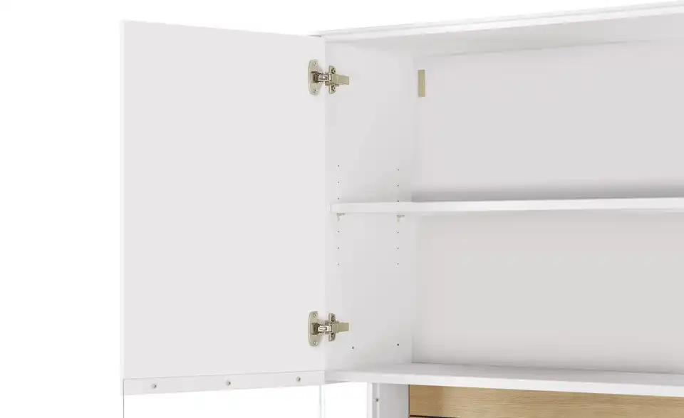 - nicht im Lieferumfang enthaltenLED-Beleuchtung, Zubehör und Rückwand-Akzent in Balkeneiche für Hängevitrine (separat erhältlich)