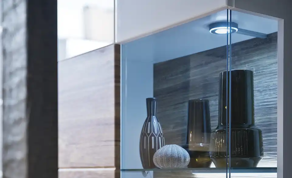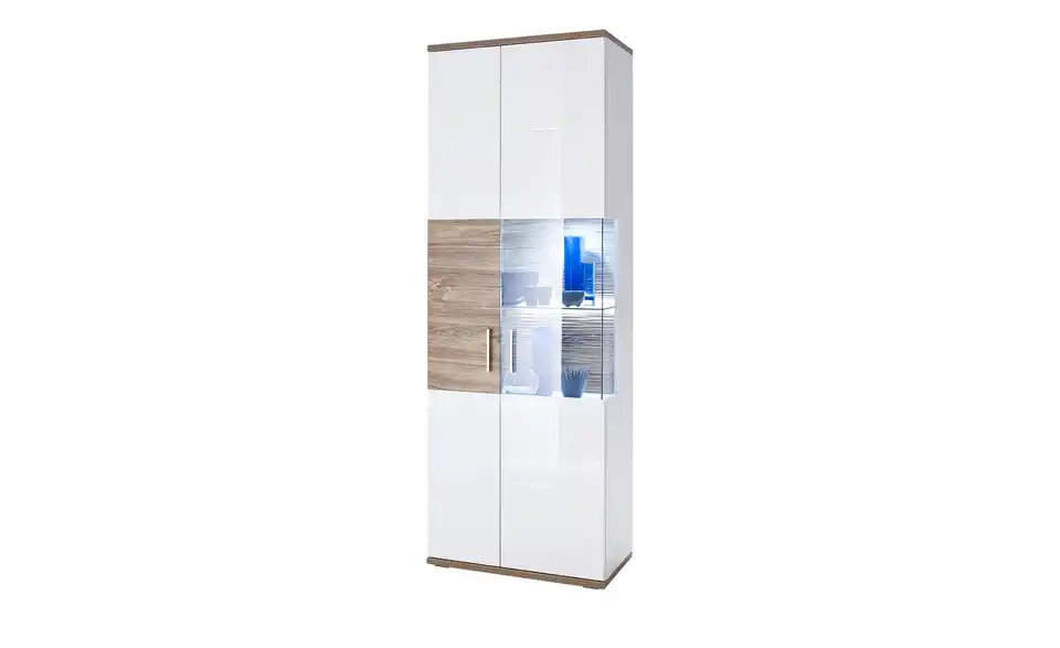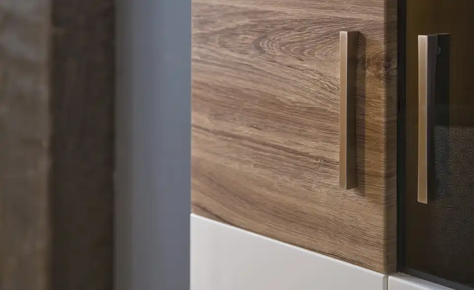 - Mehr zu MaterialFront aus MDF (Mitteldichte Faserplatte) in Weiß hochglanz tiefzieh (Nachbildung) / Absetzung aus MDF in Sterling Oak tiefzieh (Nachbildung)Korpus aus DBS (Direktbeschichtete Spanplatte) in Weiß matt Melamin (Nachbildung) / Absetzung aus DBS in Sterling Oak (Nachbildung)Front- und Seitenverglasung aus ESG (Einscheibensicherheitsglas) in Parsol Grausichtbare Rückwand aus Kunststoff in 3D-Optik Sterling Oak tiefzieh (Nachbildung)