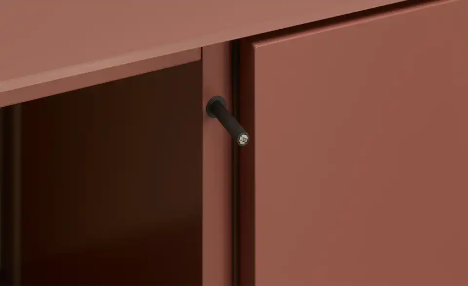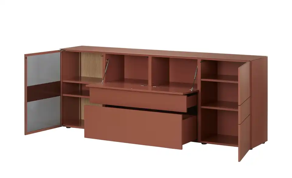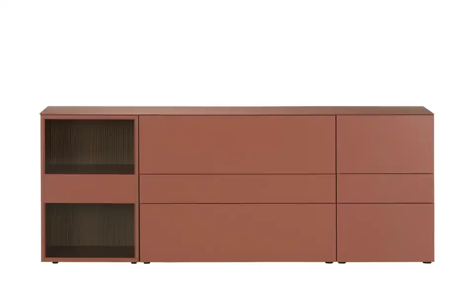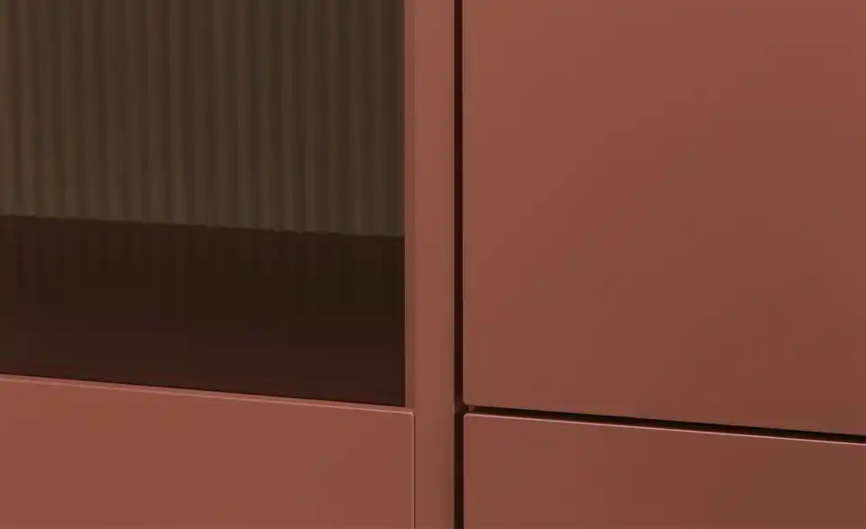 - Mehr zu MaterialKorpus und Front aus Holzwerkstoff lackiert in Samtbeere / Abdeckplatte aus Glas gefrostet in Samtbeeresichtbare Rückwände aus Holzwerkstoff furniert in Eiche milk mit RillenoptikFrontverglasung aus Parsolglas in Grau