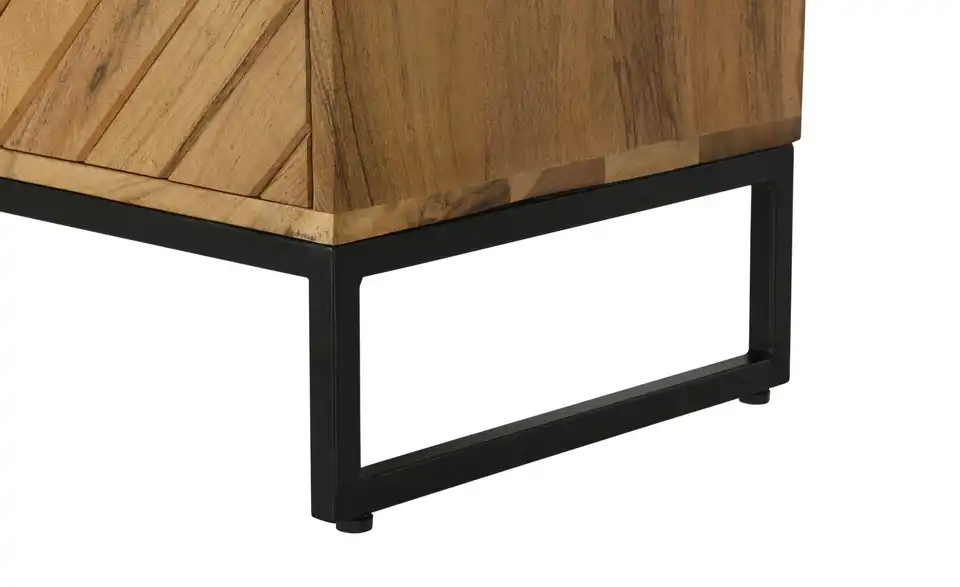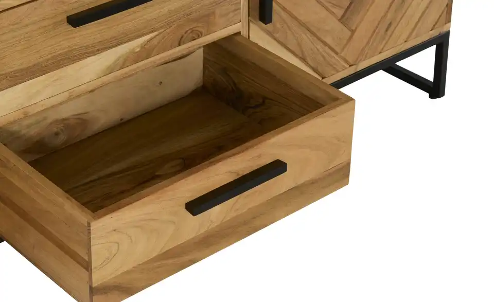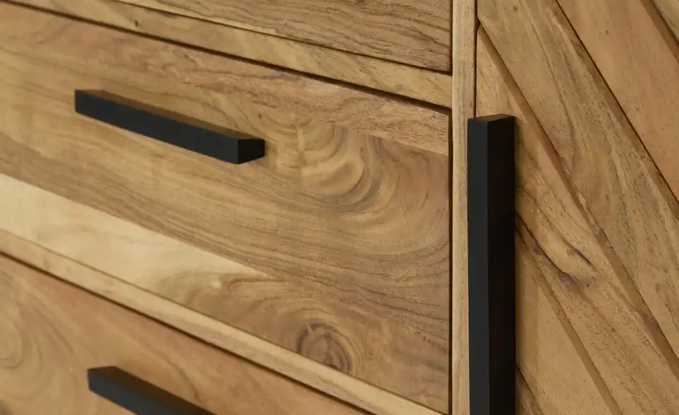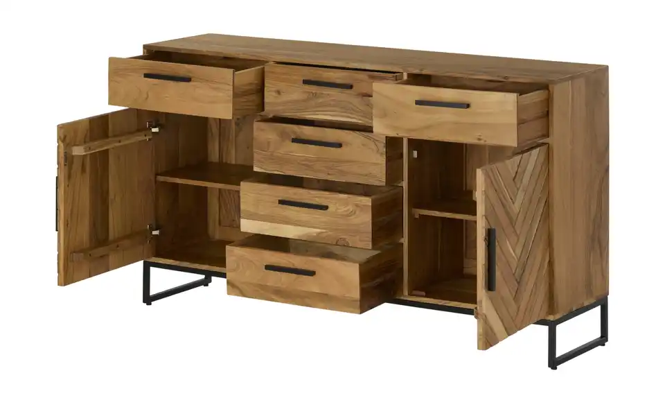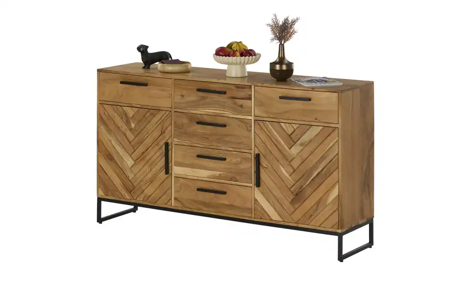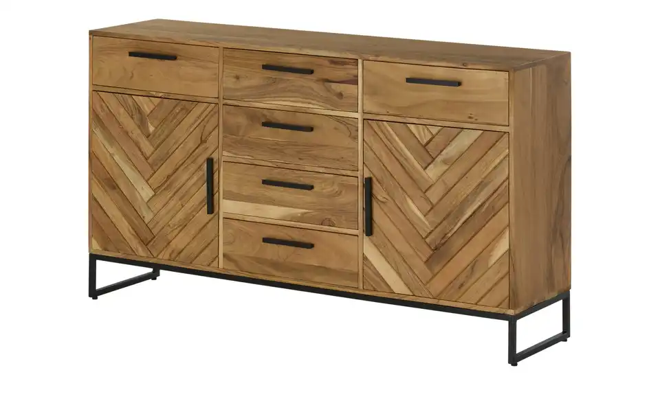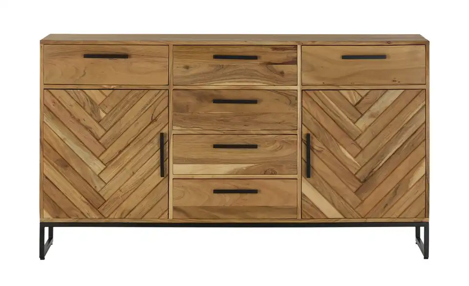 Fischgrätenmuster sieht auch bei Möbeln sehr elegant aus. Zum Beispiel beim Sideboard Calatria. Hier sind die beiden Türen mit dem Muster versehen worden. Front und Korpus bestehen aus massiver Akazie. Das Holz zeichnet sich durch seine Qualität und attraktive Maserung aus. Um die Qualität zu erhalten, ist die Oberfläche mit einem Lack behandelt worden. Als Kontrast zum Holz dienen die Griffe und das Gestell in Kufenform mit ihrem schönen Finish. Calatria ist mit sechs Schubladen und zwei Türen ausgestattet.Lieferung & Versand