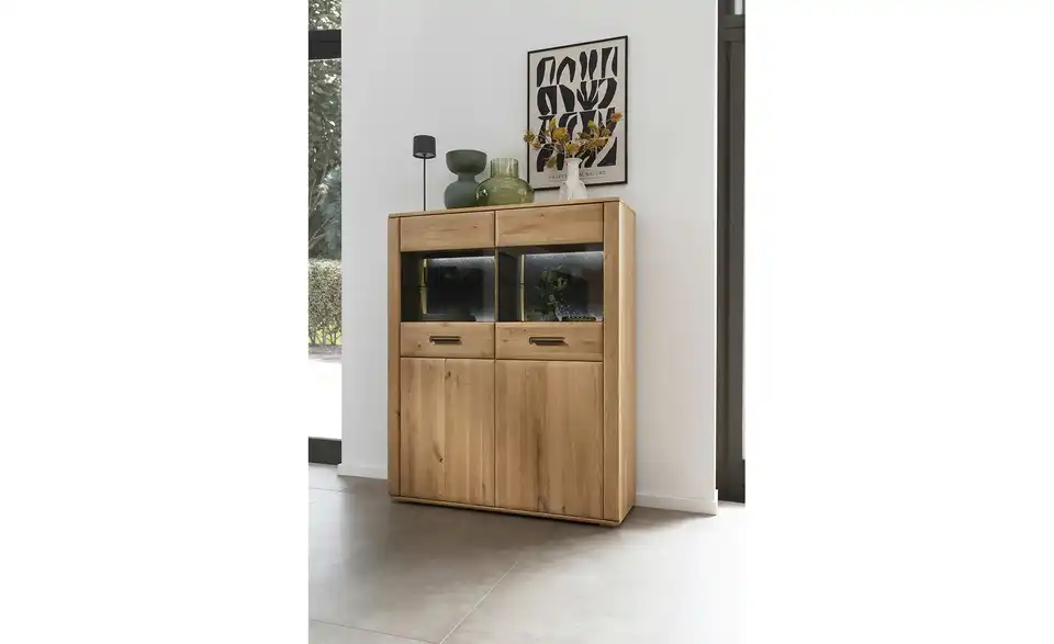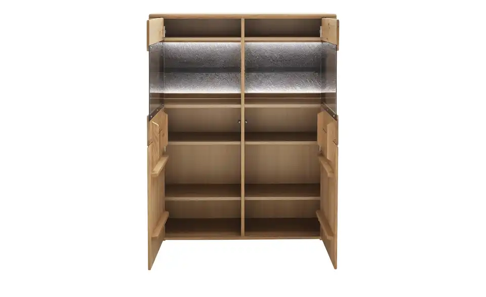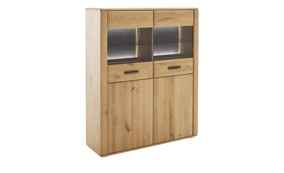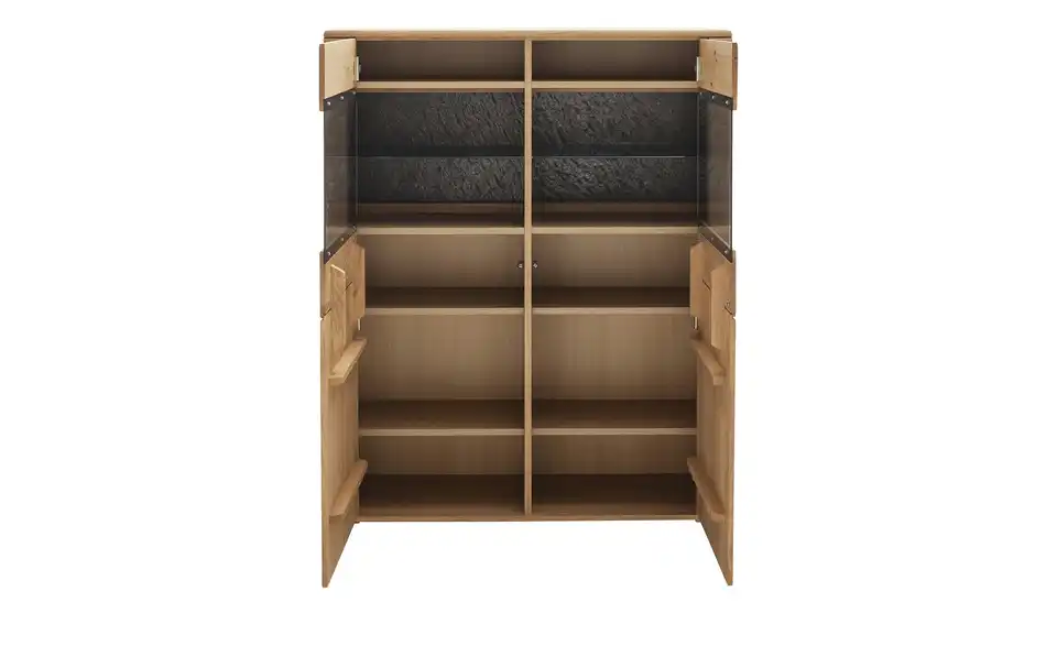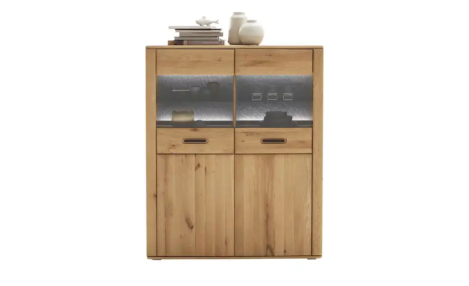 - Mehr zu MaterialFront aus Ast/Balkeneiche massiv mit durchgehender Lamelle in Kristalleiche geöltKorpus aus Ast/Balkeneiche furniert in Kristalleiche geöltsichtbare Rückwand aus Stein Furnier in AlpinGriffe aus Metall in Anthrazit