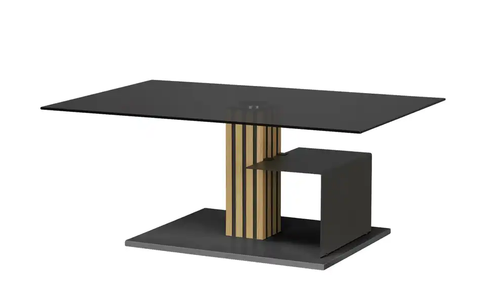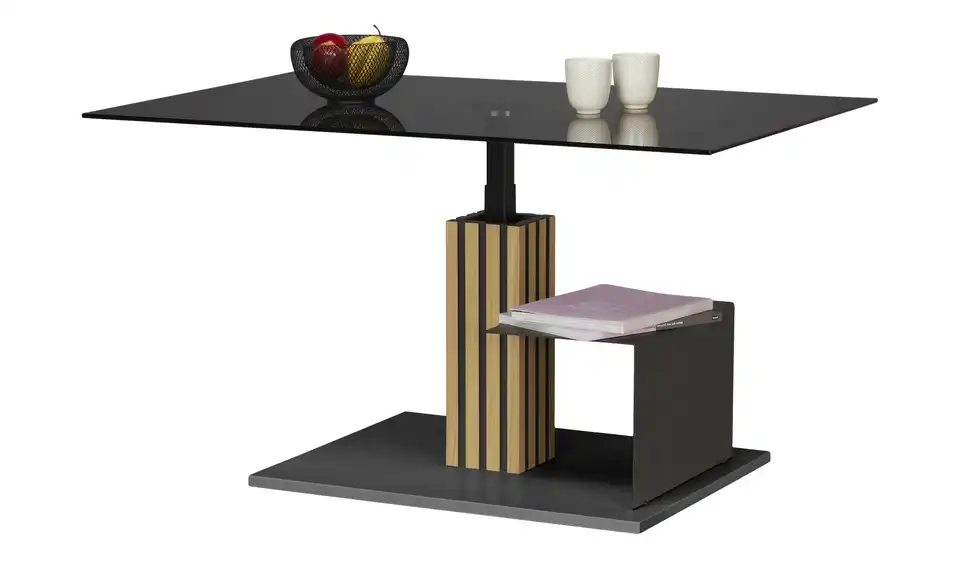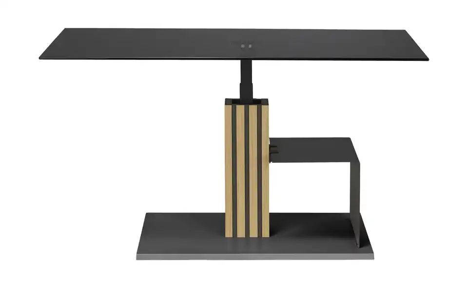 - Mehr zu MaterialTischplatte aus Parsolglas in DunkelgrauSäule aus Holzwerkstoff furniert in Eiche hellAblage aus Metall in DunkelgrauBodenplatte aus Holzwerkstoff lackiert in Schiefer Schwarz matt