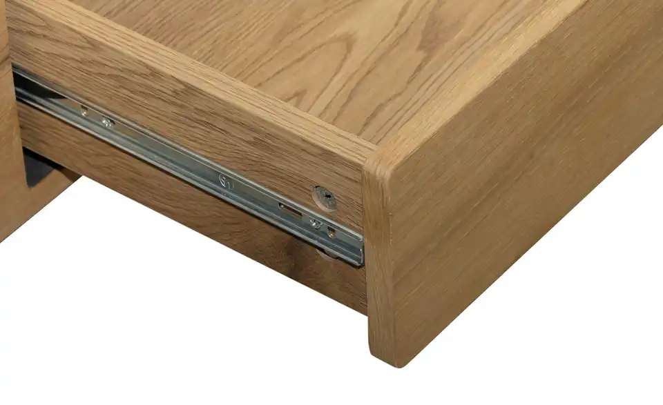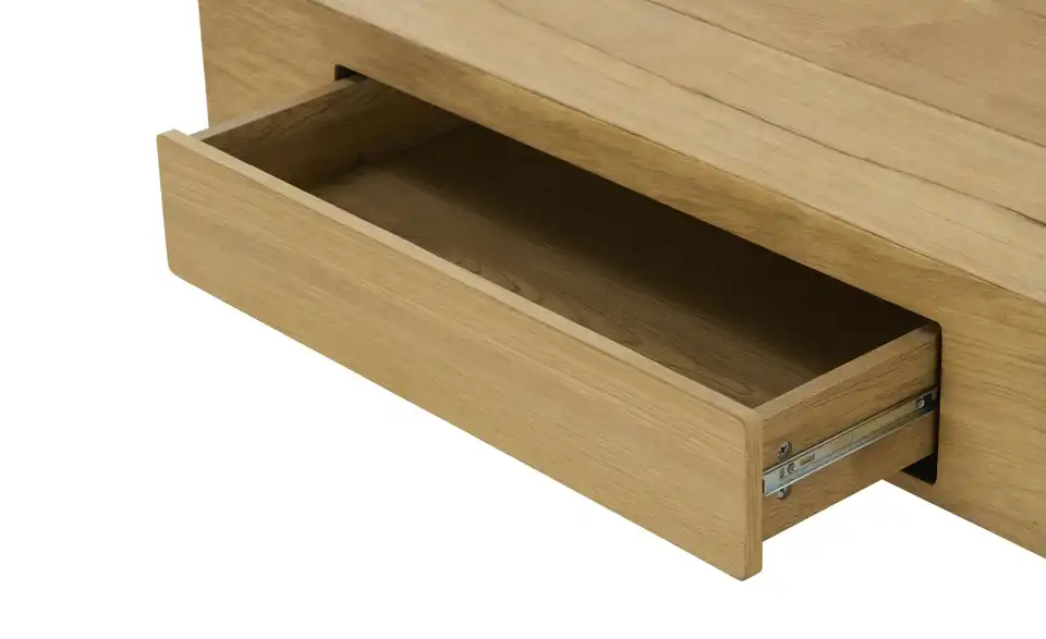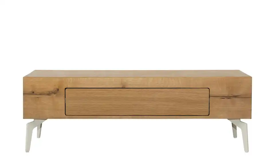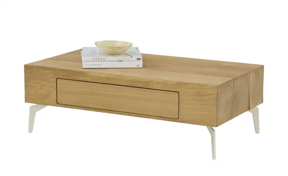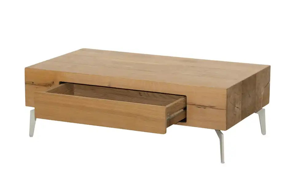 Diese Serie überzeugt mit ihrem natürlichen Furnier aus Wildeiche. Die einzigartige Maserung des Holzes macht jedes Möbelstück zu einem Unikat. Zeitgemäße Funktionen wie Push-to-Open runden das Gesamtdesign ab. Diese Serie überzeugt mit ihrem natürlichen Furnier aus Wildeiche. Die einzigartige Maserung des Holzes macht jedes Möbelstück zu einem Unikat. Zeitgemäße Funktionen wie Push-to-Open runden das Gesamtdesign ab. Dieser Couchtisch wirkt durch seine Gestaltung wie drei zusammengefügte Holzbalken. Auf der 110 x 60 Zentimeter großen Tischplatte finden Vasen, Deko und Geschirr für Kaffee und Kuchen problemlos Platz. Das grifflose Schubfach stellt blickdichten Stauraum zur Verfügung. Getragen wird der Couchtisch von cremefarbenen Metallbeinen, die dem modernen Wohnzimmermöbel eine loftige, industrielle Note geben.Lieferung & Versand