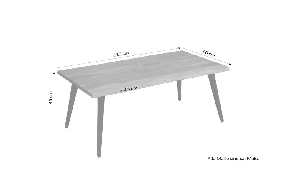 Bei diesem rustikal-loftigen Couchtisch tragen schwarze Metallfüße die attraktive Tischplatte aus massivem Akazienholz. Die Oberfläche wurde mit einem seidenmatten Lack behandelt, sodass die Holzstruktur gut zu erkennen ist. Zum Hingucker wird der Couchtisch durch die Baumkante.Lieferung & Versand