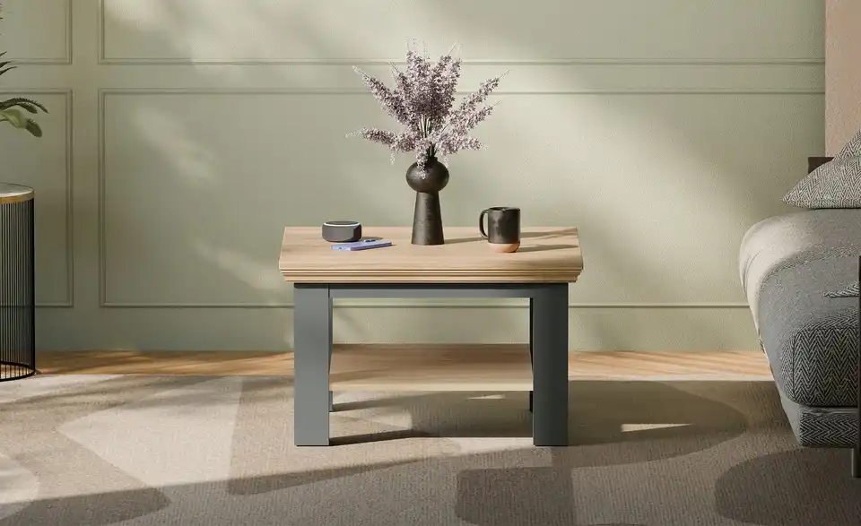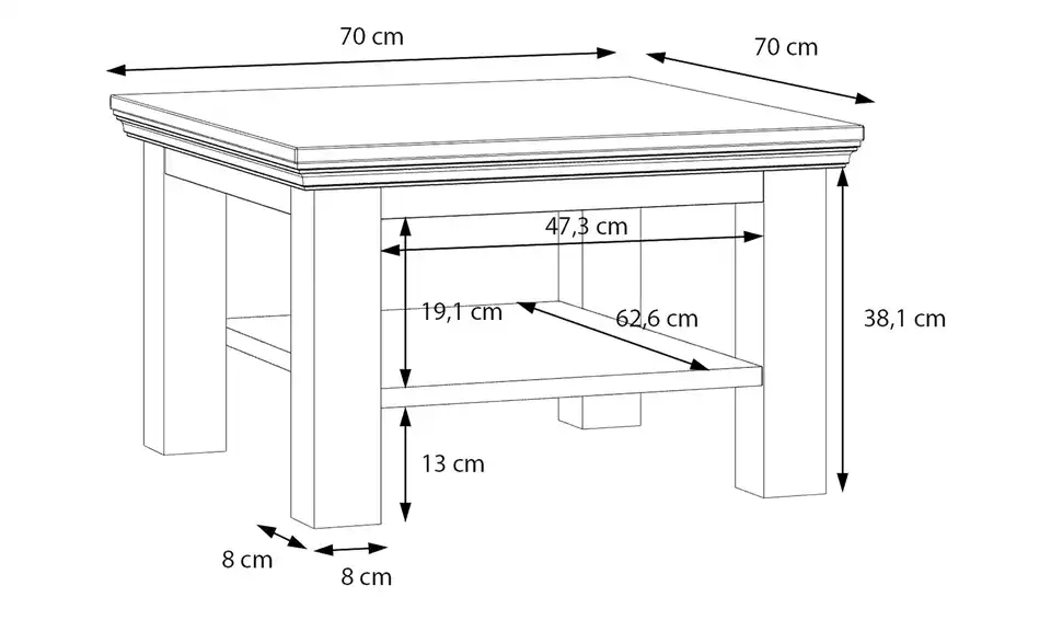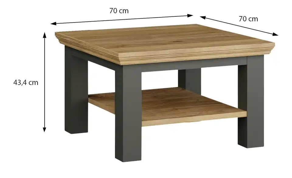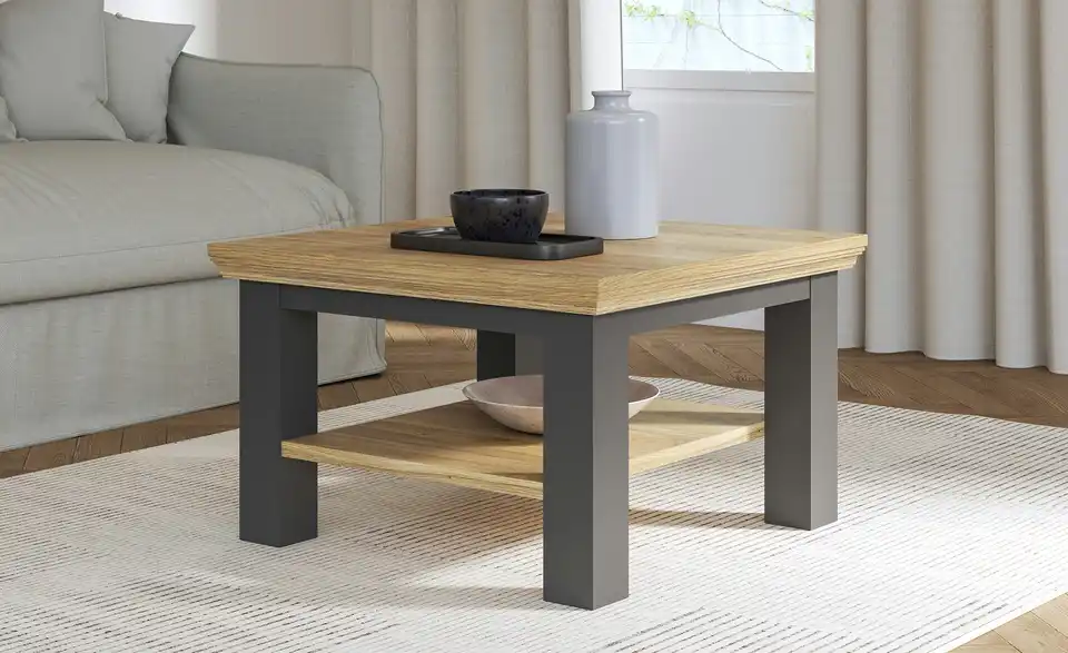 Diese Serie ist eine moderne Neuinterpretation des Landhausstils. Kassettentüren und Erhebungen sind liebevolle Details, die die Serie zu einem echten Hingucker machen. Dabei entscheiden Sie selbst, ob Sie den Landhausstil in Weiß oder Graphitgrau bevorzugen. Dieser quadratische Couchtisch passt auch in begrenzte Raumverhältnisse. Seine 70 x 70 Zentimeter große Tischplatte besitzt ein attraktives Relief und erinnert an den oberen Teil einer Säule. Darunter liegt eine praktische Ablageplatte, die Sie für Magazine oder Fernbedienungen nutzen können.Lieferung & Versand