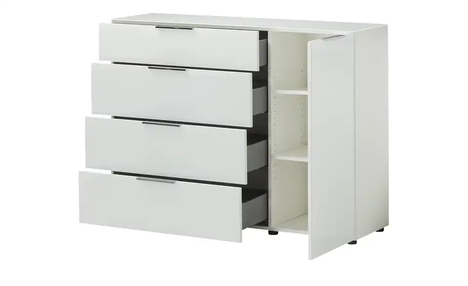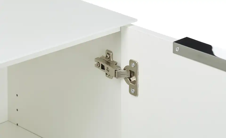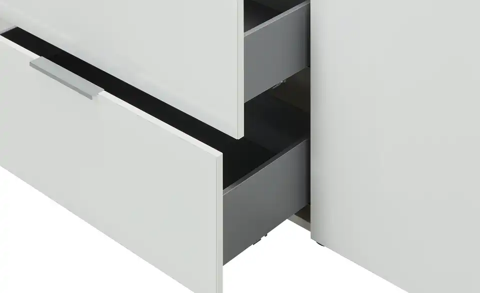 Die Serie Vitreo Neo zeigt sich in zeitlosem Weiß und mit glänzenden, chromfarbenen Akzenten. Durch das moderne Design der Serie passen die Möbel in zahlreiche Raumkonzepte. Dieses Sideboard besitzt vier geräumige Schubkästen, die mit zeitgemäßem Soft-Close ausgestattet sind. Dadurch schließen sie nahezu lautlos. Auch die Tür, hinter der sich drei Fächer befinden, schließt besonders leise. Auf der Oberfläche des Sideboards liegt ESG-Sicherheitsglas auf, das sich durch erhöhte Stoß- und Schlagfestigkeit auszeichnet. Sie können hier bedenkenlos Dekoobjekte und Alltagsdinge ablegen.Lieferung & Versand