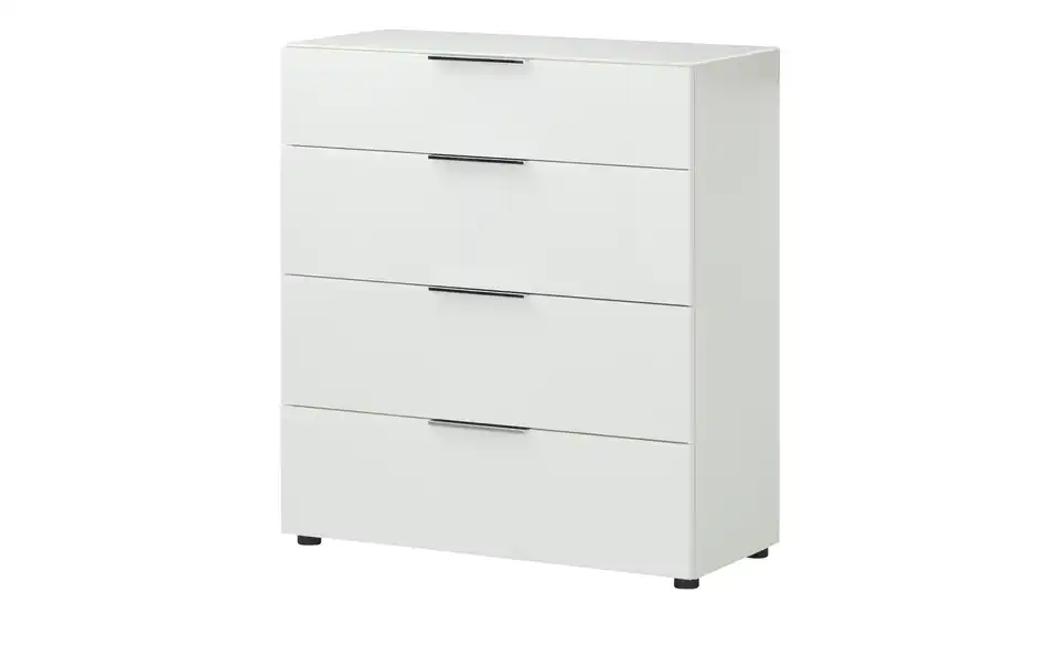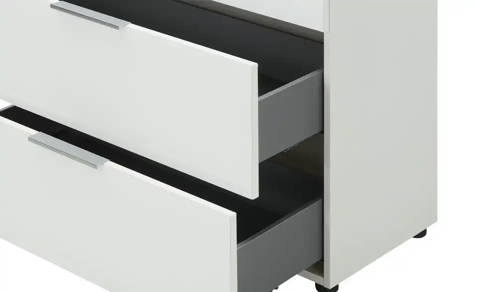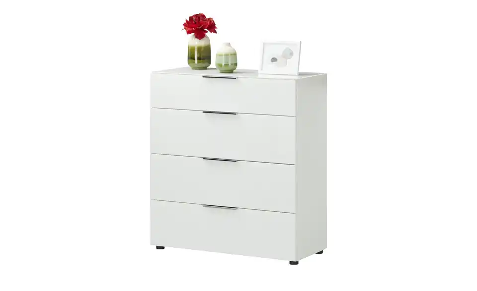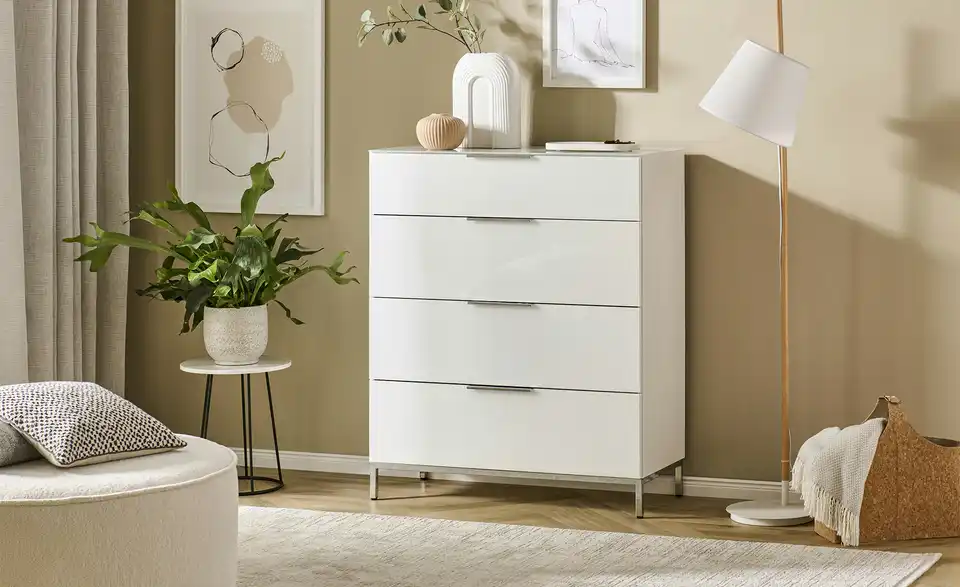 Die Serie Vitreo Neo zeigt sich in zeitlosem Weiß und mit glänzenden, chromfarbenen Akzenten. Durch das moderne Design der Serie passen die Möbel in zahlreiche Raumkonzepte. Diese Kommode besitzt vier geräumige Schubkästen, die mit zeitgemäßem Soft-Close ausgestattet sind. Dadurch schließen sie nahezu lautlos. Auf der Oberfläche der Kommode liegt ESG-Sicherheitsglas auf, das sich durch erhöhte Stoß- und Schlagfestigkeit auszeichnet. Sie können hier bedenkenlos Dekoobjekte und Alltagsdinge ablegen.Lieferung & Versand