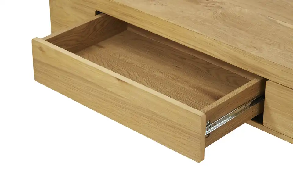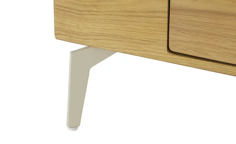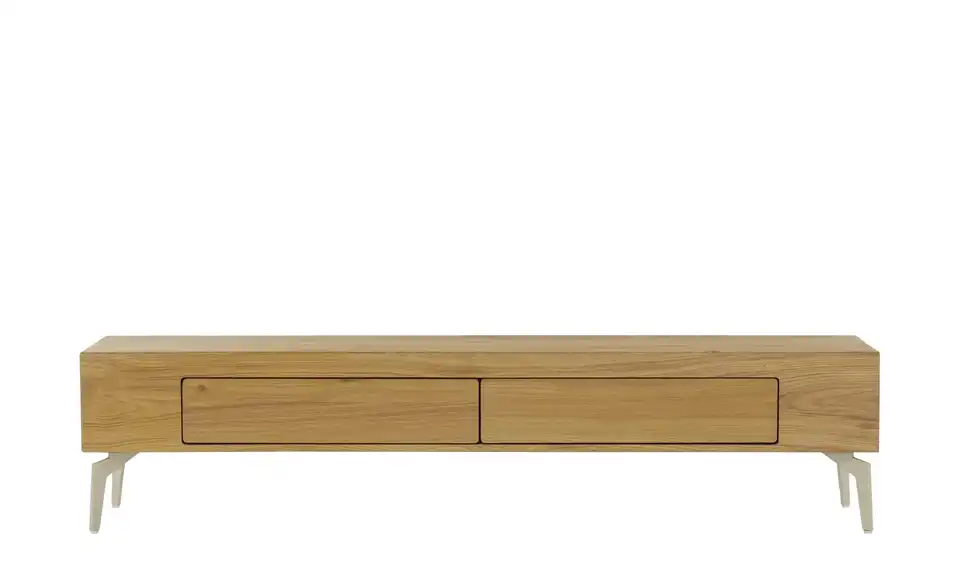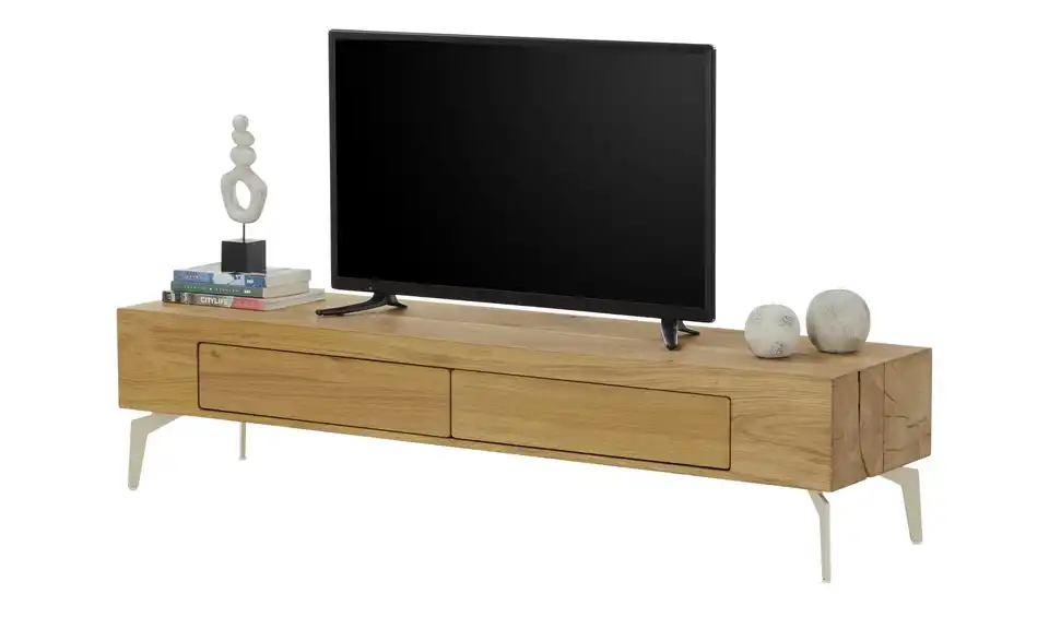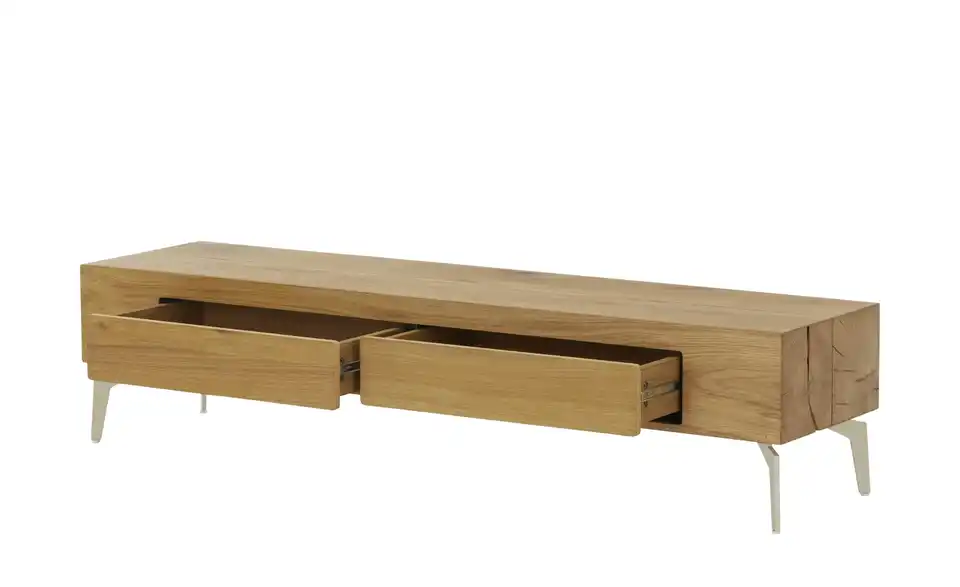 Diese Serie überzeugt mit ihrem natürlichen Furnier aus Wildeiche. Die einzigartige Maserung des Holzes macht jedes Möbelstück zu einem Unikat. Zeitgemäße Funktionen wie Push-to-Open runden das Gesamtdesign ab. Bei diesem TV-Lowboard wirkt die 160 x 40 Zentimeter große Ablagefläche wie aus zwei Holzbalken zusammengesetzt. Zwei praktische Schubläden stellen Stauraum für Magazine und Wohnzimmerzubehör zur Verfügung. Getragen wird das TV-Lowboard von cremefarbenen Metallfüßen, die dem modernen Wohnzimmermöbel eine loftige, industrielle Note geben.Lieferung & Versand