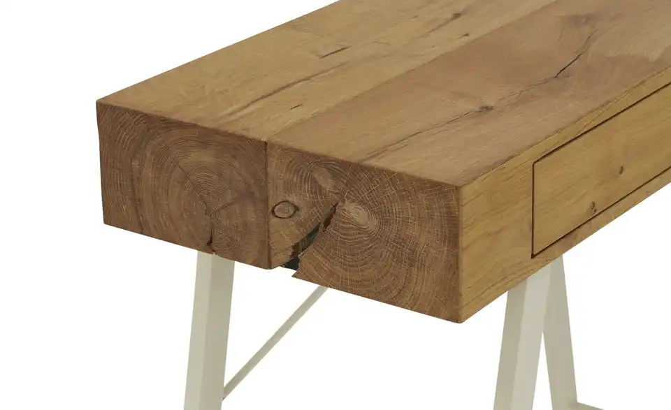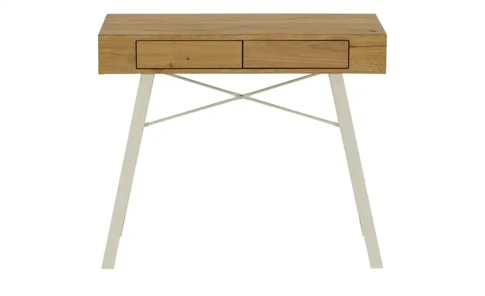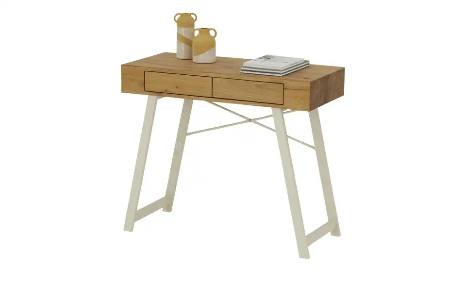 Diese Serie überzeugt mit ihrem natürlichen Furnier aus Wildeiche. Die einzigartige Maserung des Holzes macht jedes Möbelstück zu einem Unikat. Zeitgemäße Funktionen wie Push-to-Open runden das Gesamtdesign ab. Dieser Konsolentisch bringt eine 90 x 40 Zentimeter große Arbeitsfläche mit, die wie zwei zusammengefügte Holzbalken aussieht. Die attraktive Wildeichenoptik wird hier mit zeitlosem Cremeweiß kombiniert, sodass ein moderner Look mit loftigem Design entsteht. Außerdem praktisch: Die beiden grifflosen Schubfächer bieten blickdichten Stauraum und lassen sich kinderleicht mit Push-to-Open öffnen.Lieferung & Versand