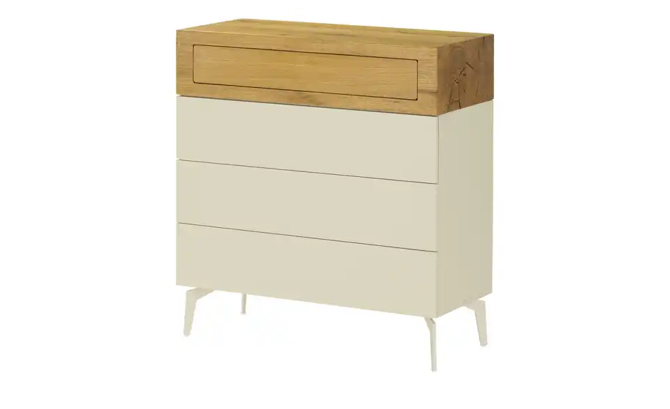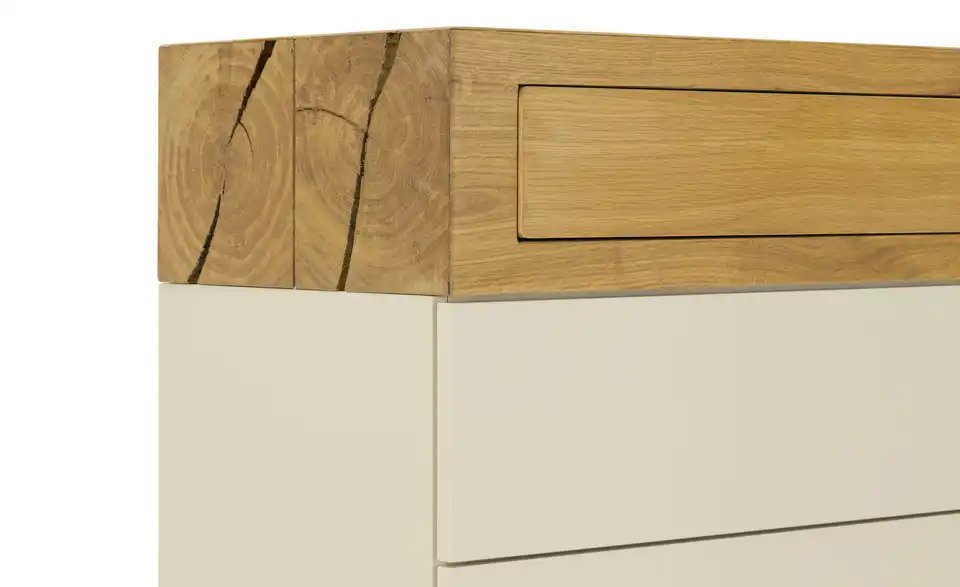Diese Serie überzeugt mit ihrem natürlichen Furnier aus Wildeiche. Die einzigartige Maserung des Holzes macht jedes Möbelstück zu einem Unikat. Zeitgemäße Funktionen wie Push-to-Open runden das Gesamtdesign ab. Diese Kommode bringt insgesamt 4 Schubkästen mit blickdichtem Stauraum mit. Das zeitlose Cremeweiß wird durch einen oberen Bereich in Wildeichenoptik akzentuiert, der wie zwei zusammengefügte Holzbalken wirkt. In Kombination mit den hellen Metallfüßen entsteht ein moderner Look mit loftiger Note.Lieferung & Versand