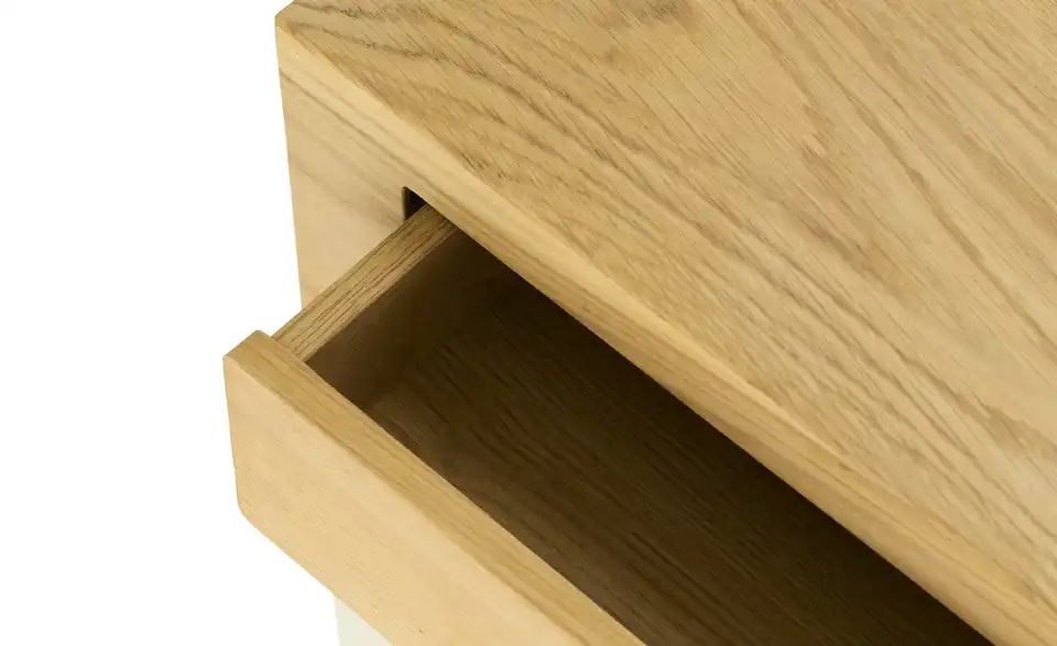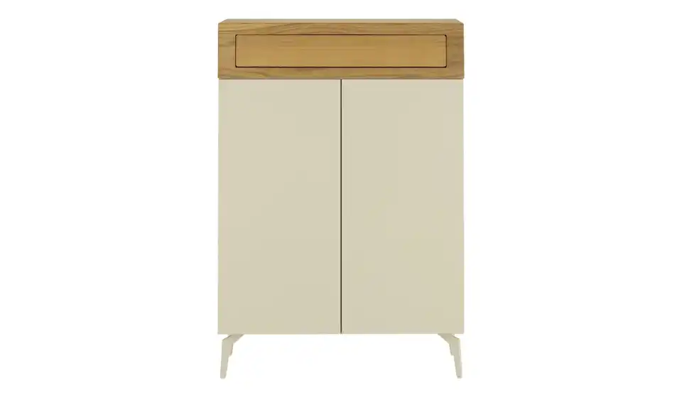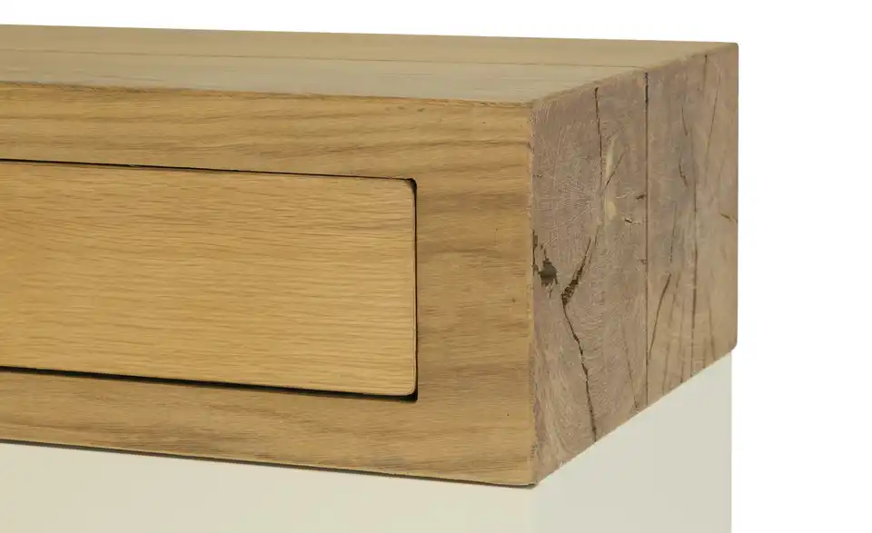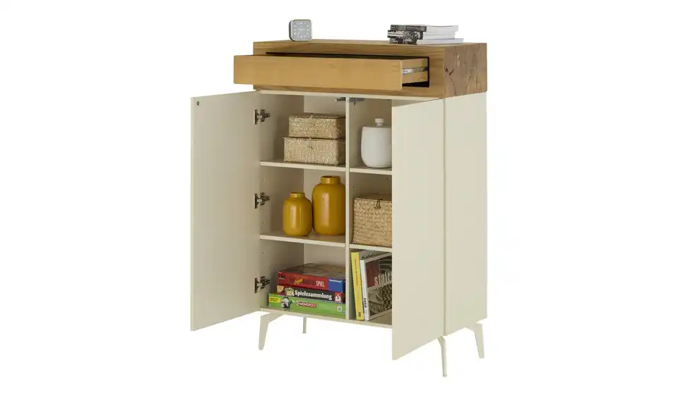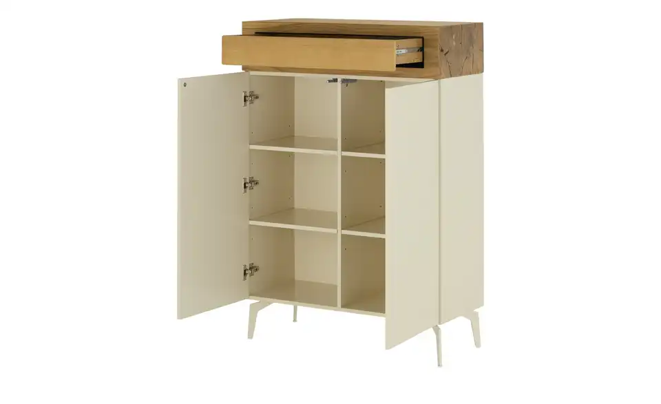 Diese Serie überzeugt mit ihrem natürlichen Furnier aus Wildeiche. Die einzigartige Maserung des Holzes macht jedes Möbelstück zu einem Unikat. Zeitgemäße Funktionen wie Push-to-Open runden das Gesamtdesign ab. Dieses Highboard bringt sechs blickdichte Fächer und ein geräumiges Schubfach mit. Das zeitlose Cremeweiß wird durch einen oberen Bereich in Wildeichenoptik akzentuiert, der wie zwei zusammengefügte Holzbalken wirkt. In Kombination mit den hellen Metallfüßen entsteht ein moderner Look mit loftiger Note.Lieferung & Versand