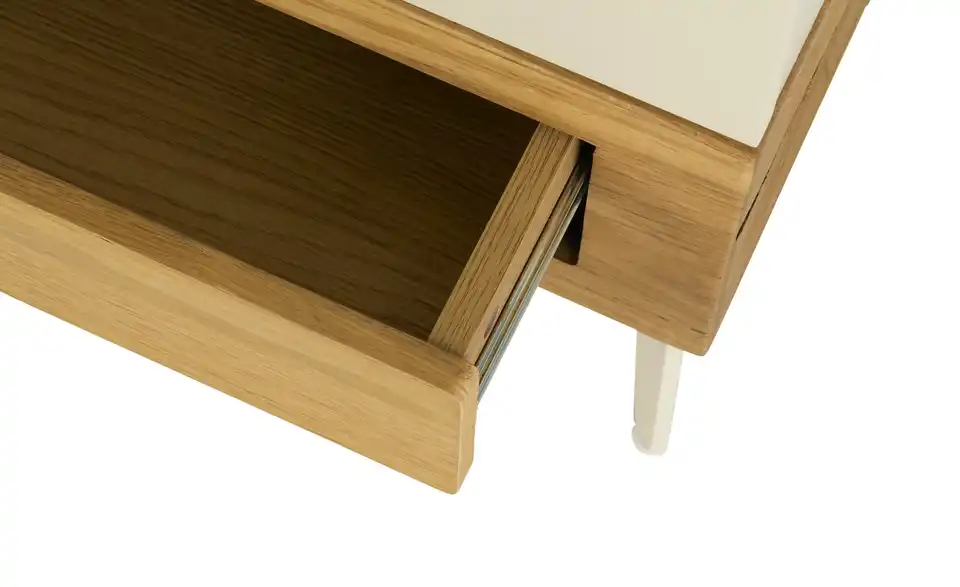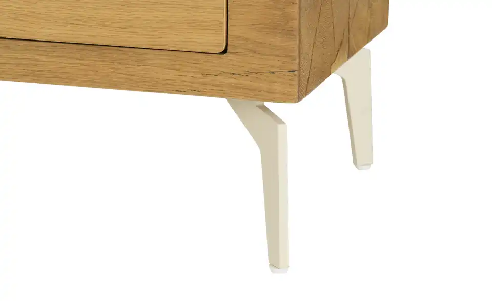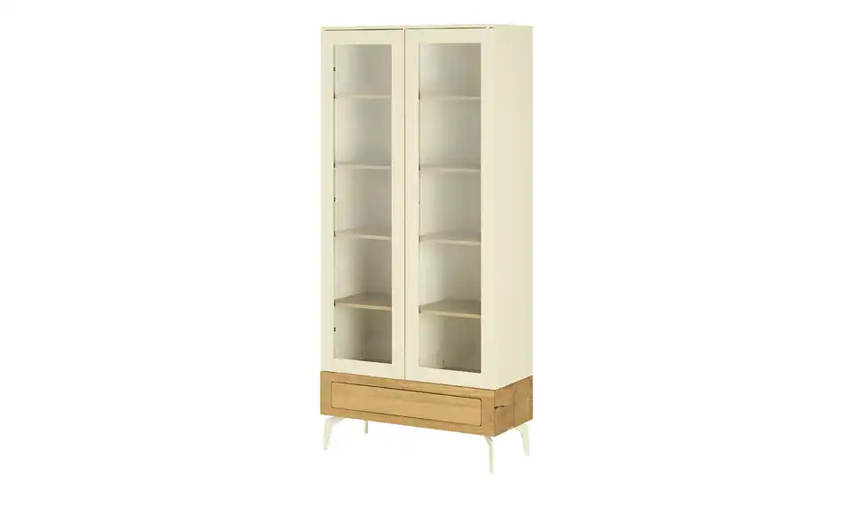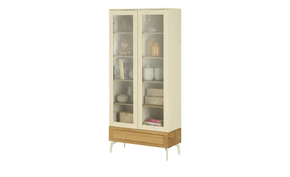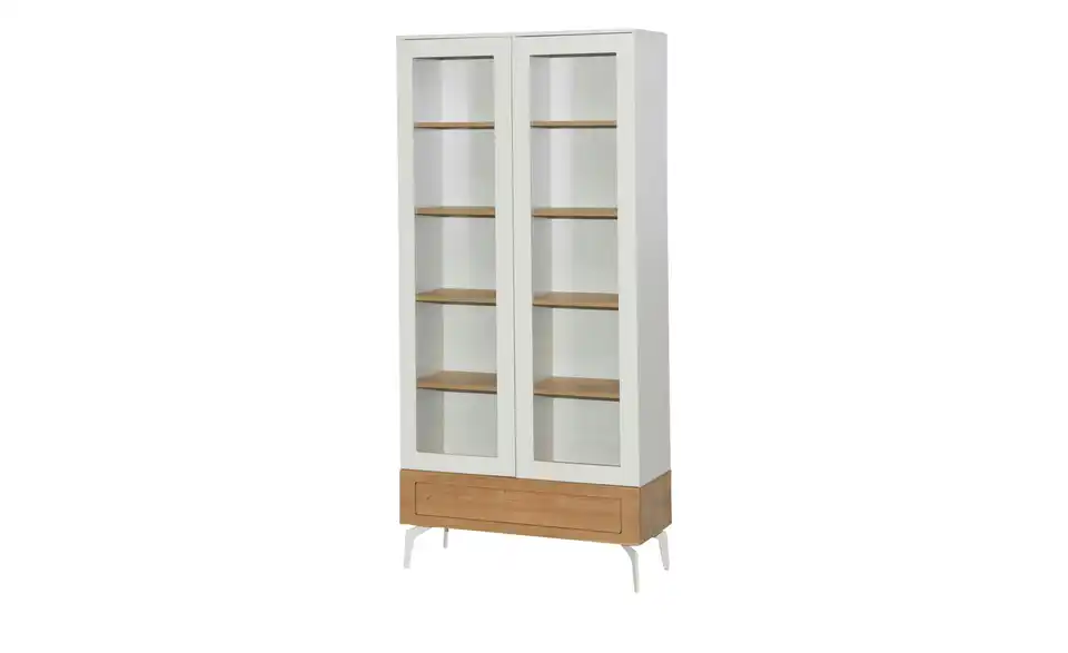 Diese Serie überzeugt mit ihrem natürlichen Furnier aus Wildeiche. Die einzigartige Maserung des Holzes macht jedes Möbelstück zu einem Unikat. Zeitgemäße Funktionen wie Push-to-Open runden das Gesamtdesign ab. Diese Vitrine bringt gleich 10 einsehbare Fächer für Geschirr, Dekoration oder Lieblingsbücher mit. Das zeitlose Cremeweiß wird durch Einlegeböden in natürlicher Wildeichenoptik aufgebrochen. In Kombination mit den hellen Metallfüßen entsteht ein moderner Look mit loftiger Note. Außerdem praktisch: im unteren Bereich gibt es ein griffloses Schubfach, dass Sie kinderleicht mit Push-to-Open öffnen können. Hier finden lose Dinge Platz, die Sie blickdicht verstauen wollen.Lieferung & Versand