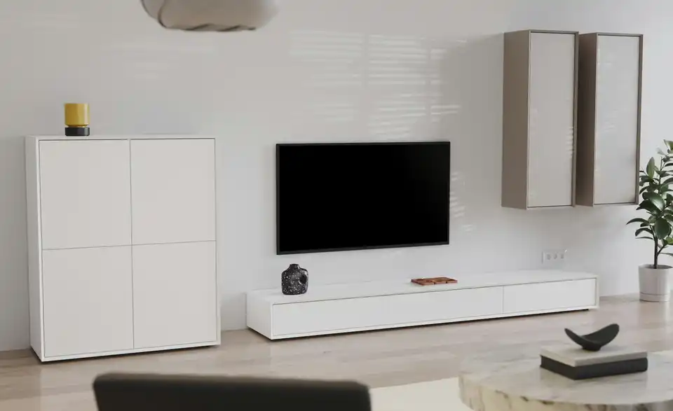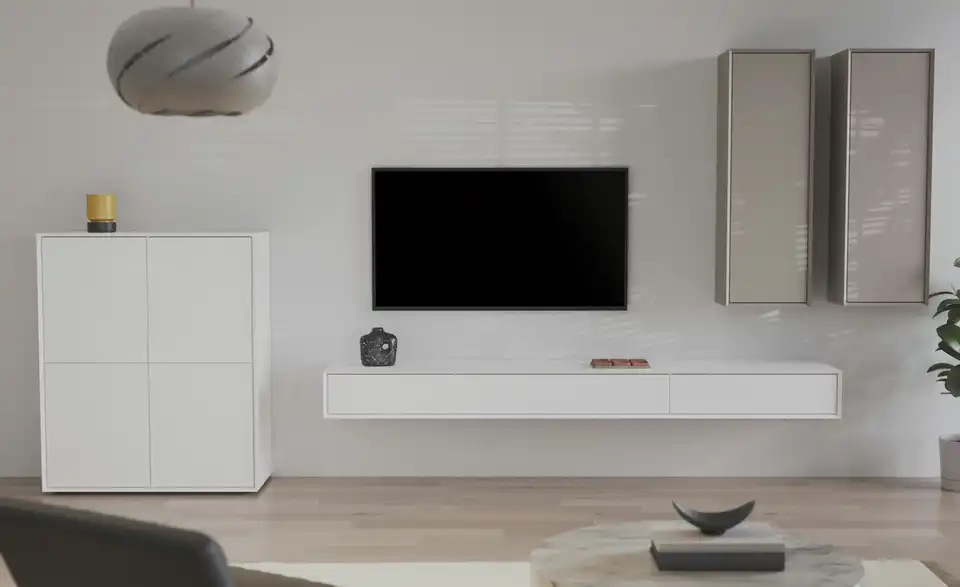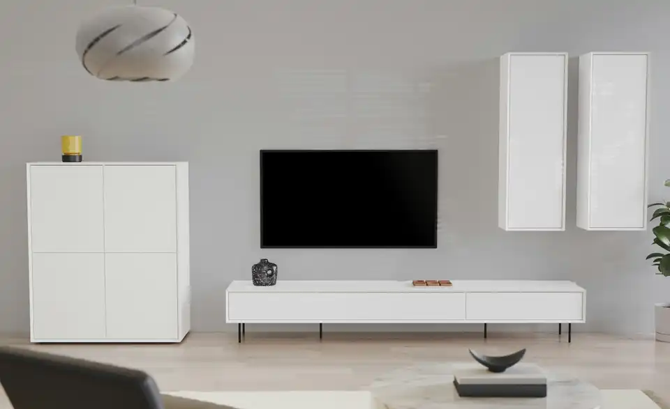 Minimalistisch, modern und kombinationsfreudig: Dieses TV-Lowboard passt in diverse Einrichtungsstile und Raumkonzepte. Die grifflosen Klappen öffnen mit zeitgemäßem Push-to-Open und geben dann den Blick auf die drei Fächer mit insgesamt zwei Kabeldurchlässen frei. Gut zu wissen: Dank der mitgelieferten Hängebeschläge können Sie das TV-Lowboard auch an der Wand anbringen.Lieferung & Versand