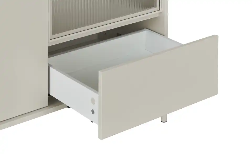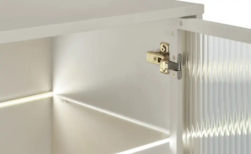 Dieses Sideboard verbindet modernes Design mit zeitgemäßen Funktionen und Stauraum. Grifflose, einfarbige Fronten lassen sich durch die Push-to-open-Funktion kinderleicht öffnen. Auf der rechten Seite befindet sich ein halbdurchsichtiger Bereich, der an ein Vitrinenfach erinnert. Durch die Riffeloptik der Glastür schimmern die dahinter platzierten Dekoobjekte nur dezent durch. Die mitgelieferte Glaskantenbeleuchtung, die übrigens auch über eine Timer-Funktion verfügt, sorgt hier für ein echtes Wohlfühl-Ambiente. Außerdem praktisch: Sie können die Farbe des Lichts mit der Fernbedienung mühelos ändern.Lieferung & Versand