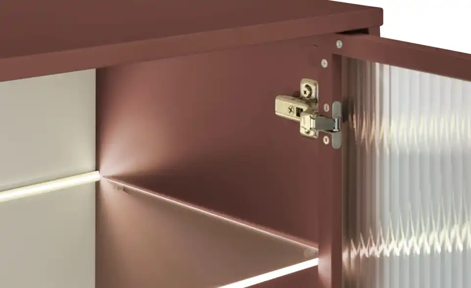 Dieses Sideboard verbindet modernes Design mit zeitgemäßen Funktionen und Stauraum. Grifflose, einfarbige Fronten lassen sich durch die Push-to-open-Funktion kinderleicht öffnen. Auf der rechten Seite befindet sich ein halbdurchsichtiger Bereich, der an ein Vitrinenfach erinnert. Durch die Riffeloptik der Glastür schimmern die dahinter platzierten Dekoobjekte nur dezent durch. Die mitgelieferte Glaskantenbeleuchtung, die übrigens auch über eine Timer-Funktion verfügt, sorgt hier für ein echtes Wohlfühl-Ambiente. Außerdem praktisch: Sie können die Farbe des Lichts mit der Fernbedienung mühelos ändern.Lieferung & Versand
