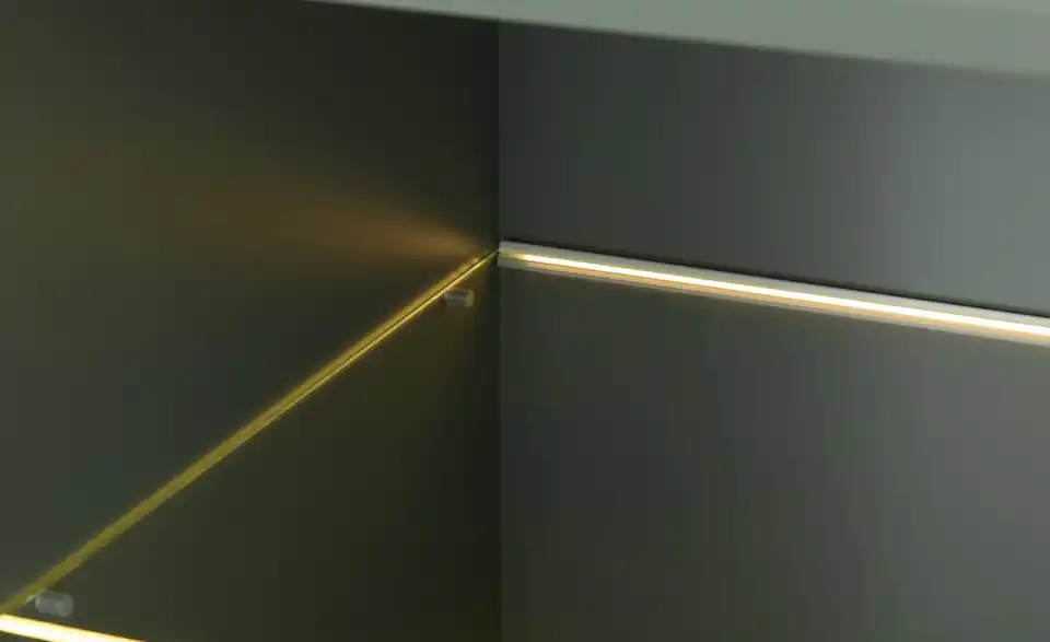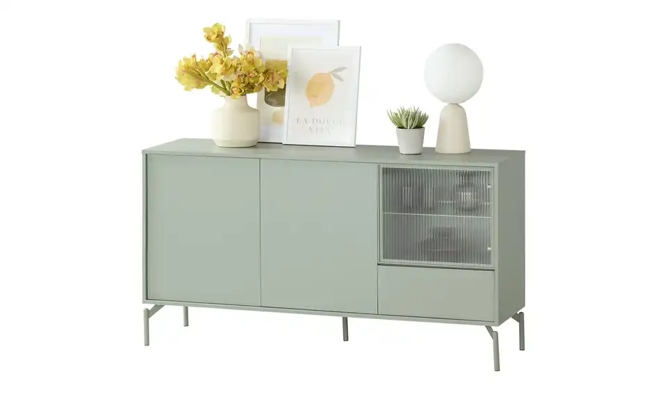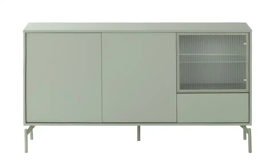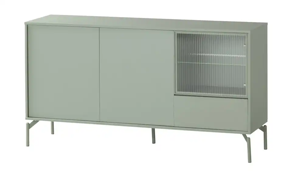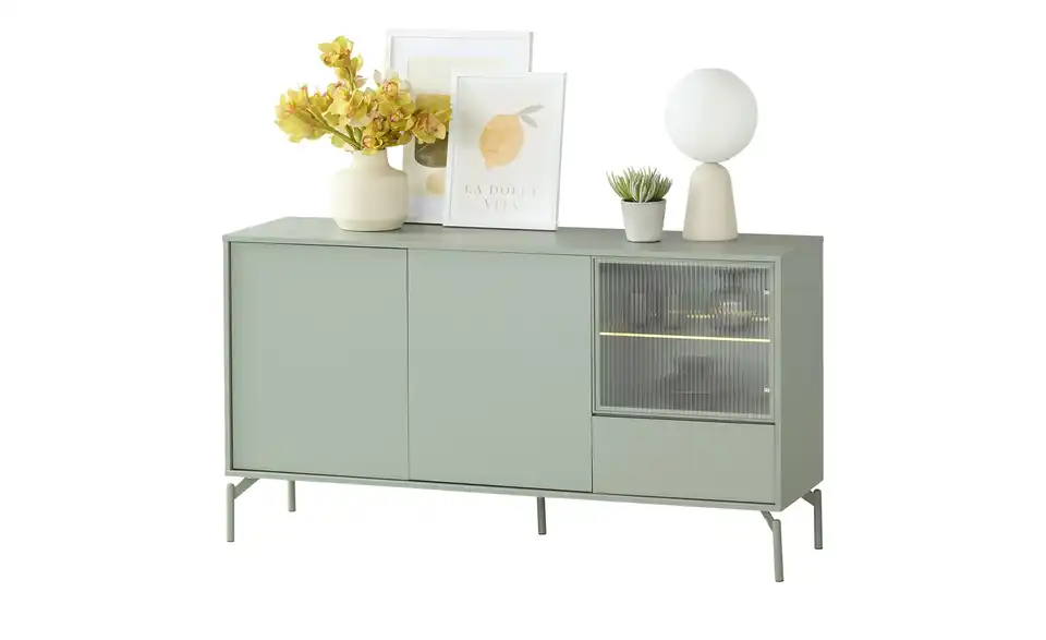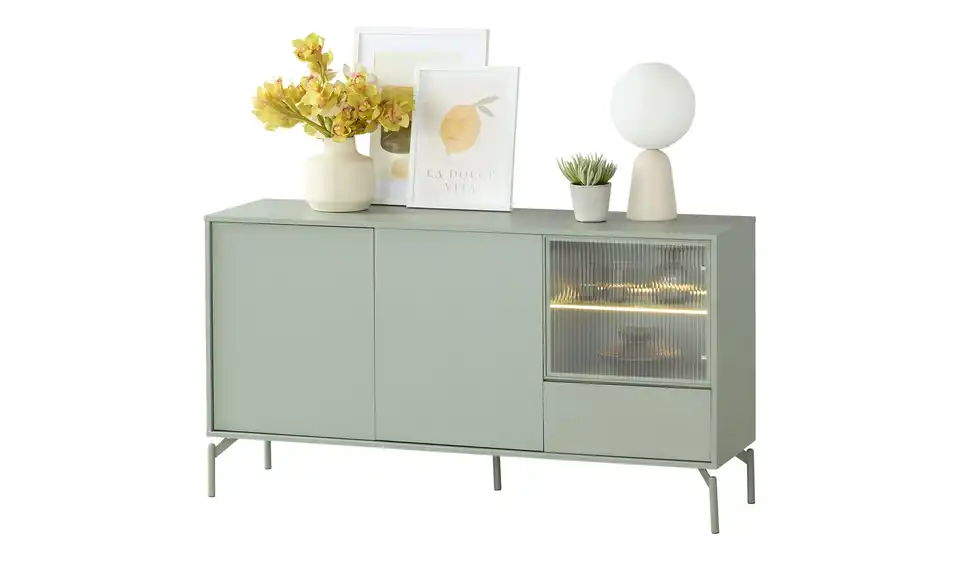Dieses Sideboard verbindet modernes Design mit zeitgemäßen Funktionen und Stauraum. Grifflose, einfarbige Fronten lassen sich durch die Push-to-open-Funktion kinderleicht öffnen. Auf der rechten Seite befindet sich ein halbdurchsichtiger Bereich, der an ein Vitrinenfach erinnert. Durch die Riffeloptik der Glastür schimmern die dahinter platzierten Dekoobjekte nur dezent durch. Die mitgelieferte Glaskantenbeleuchtung, die übrigens auch über eine Timer-Funktion verfügt, sorgt hier für ein echtes Wohlfühl-Ambiente. Außerdem praktisch: Sie können die Farbe des Lichts mit der Fernbedienung mühelos ändern.Lieferung & Versand