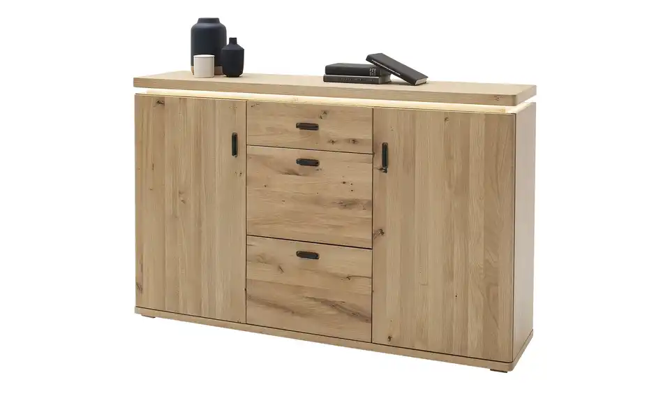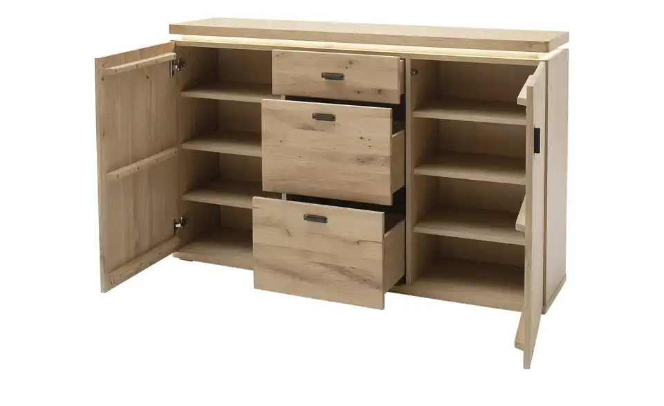 - Mehr zu MaterialKorpus Spanplatte furniert (Eiche)Front Massivholz (Balkeneiche)Rückwand HDF