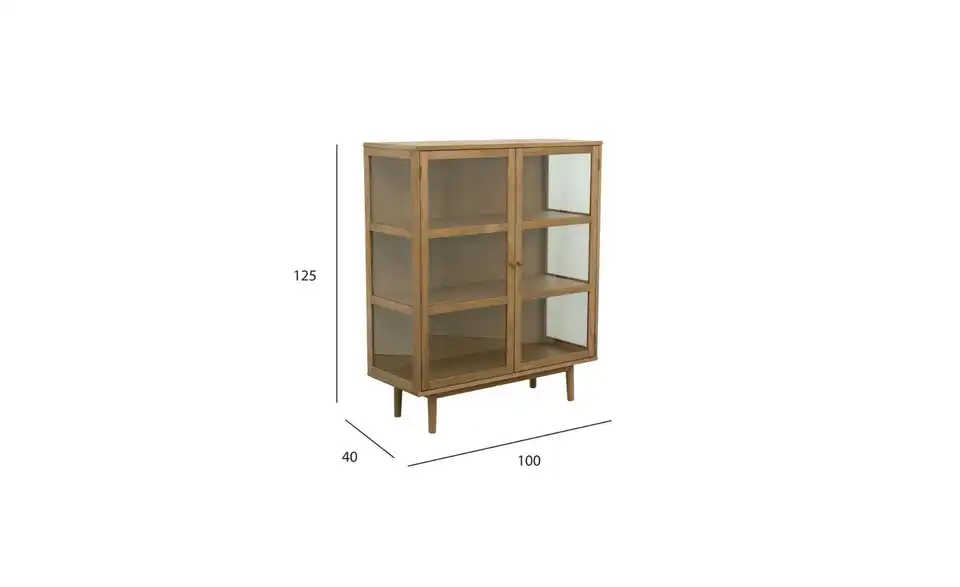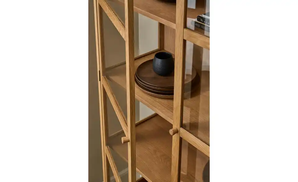 - Mehr zu MaterialRahmen und Beine aus massiver Eiche, Böden und Rückwand aus MDF-Eichenfurnier, Türen und Seiten aus gehärtetem Glas, Eiche Furnier, Lackiert