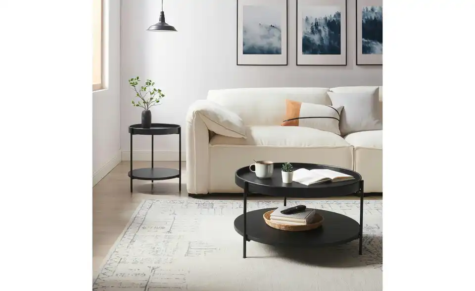 - Mehr zu Materialmit 2 Ablageflächen, Tischplatten Mitteldichte Holzfaserplatte (MDF) mit Eschenholzfurnier, lackiert, Gestell: Metall, pulverbeschichtet matt