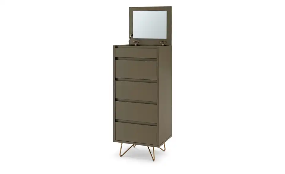 - Mehr zu Ausstattung / FunktionBeine aus Metall mit Messinglegierung, 4 Schubladen ausziehbar, Deckel mit Spiegel aufklappbar inkl. Klappendämpfer und zusätzlichem Ablagefach, Wandbefestigung ist aus Sicherheitsgründen erforderlich