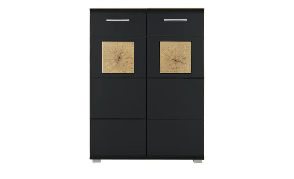 Bis zu 12 Paar Schuhe passen in den Schuhschrank Cortina. Dafür sind hinter den zwei Drehtüren gleich vier Fächer vorhanden. Die Einlegeböden sind in der Höhe variabel, so dass Sie die Größe der Fächer variieren können. Im Schrankinneren befindet sich ebenfalls eine Schublade, die man bei geschlossenen Türen nicht sehen kann. An den beiden Türen befinden sich quadratische Absetzungen in Hirnholzoptik.Lieferung & Versand