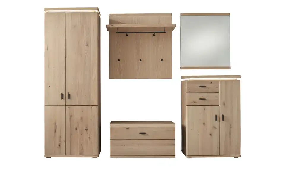 - Mehr zu MaterialKorpusse Spanplatte furniert (Eiche)Fronten, Blenden Massivholz (Balkeneiche)Paneel inkl. Hutablage Spanplatte furniert (Eiche)Spiegel Trägerplatte: Spanplatte furniert (Eiche)Kleiderstange, Haken Metall pulverbeschichtet