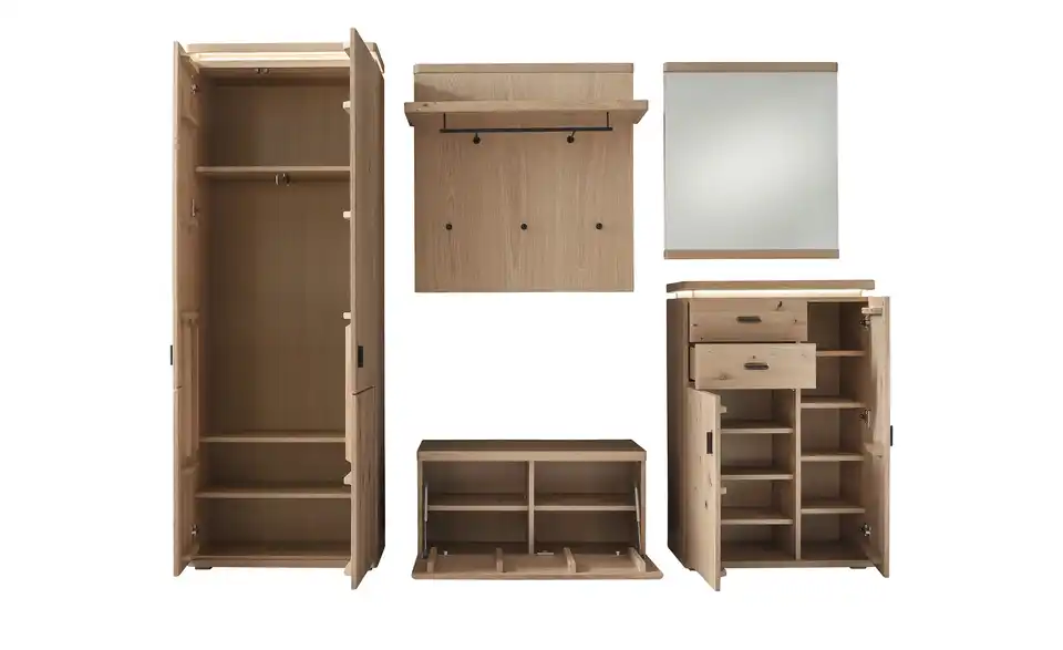 - Mehr zu MaßenGarderobenschrank BHT ca. 75 x 204 x 38 cmGarderobenpaneel BHT ca. 98 x 93 x 30 cmGarderobenbank BHT ca. 90 x 47 x 38 cmSchuhkommode BHT ca. 75 x 111 x 38 cmSpiegel BHT ca. 75 x 82 x 3 cm