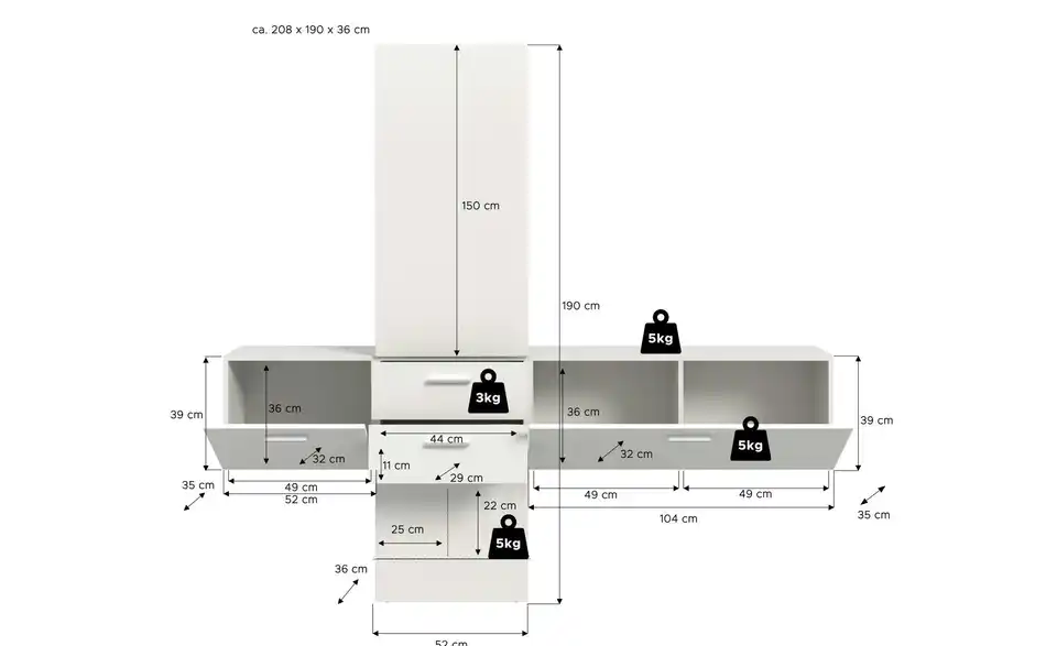 - max. Belastbarkeit je Schubkasten bis ca.2 kg